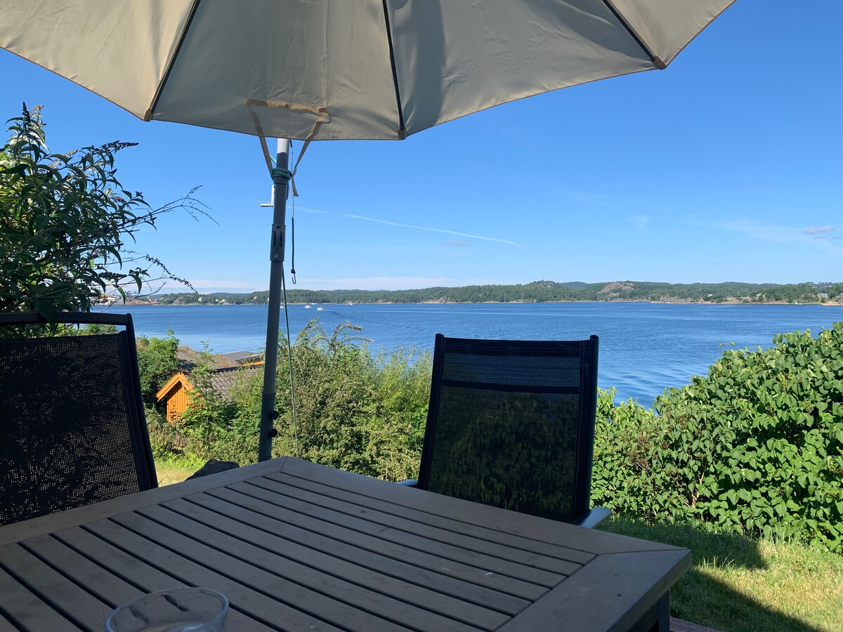 Hyggelig hytte på Tromøy med robåd og kajplads.