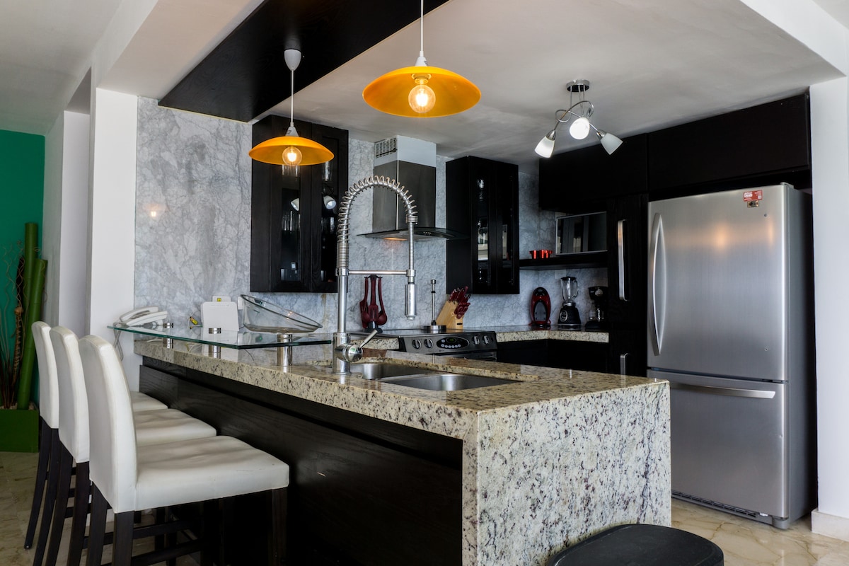 Nyd luksus og komfort i vores lejlighed! Den har 1 elegant soveværelse med havudsigt, en privat og rummelig terrasse med spektakulær udsigt. Et par minutters gang fra stranden og Quinta Avenida. Privat, sikker og gratis parkering. Tagterrasse med udsigt over Det Caribiske Hav, swimmingpool, jacuzzi, fitnessrum og dampbad. Den har også en lobby og reception og sikkerhed 24/7. Book nu, og få en uforglemmelig oplevelse!