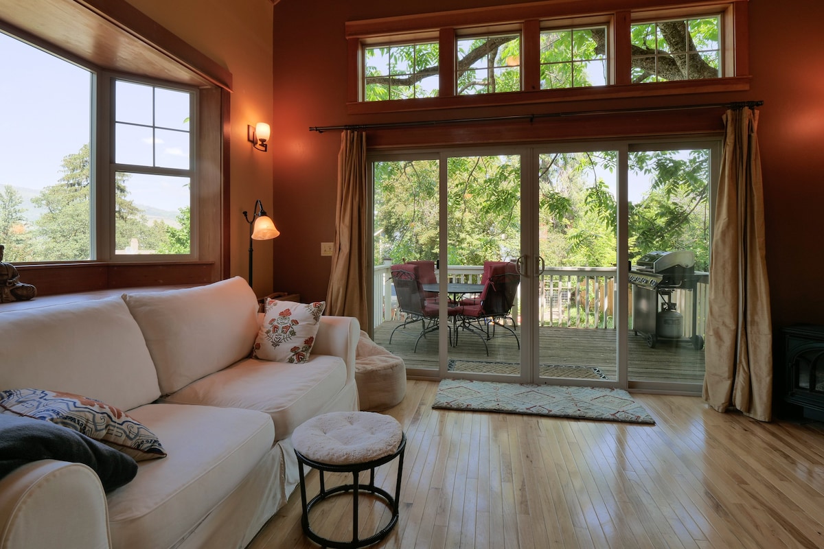 Dette private, komfortable gæstehus i to etager ligger en blok fra Downtown! Med stilfulde møbler, en stor møbleret privat terrasse og en plads med plads til fire personer, er det helt sikkert et godt besøg. Nyd en kort gåtur til Shakespeare (6-8 minutter per iPhone-kort), gode kaffebarer, Lithia Park, fantastiske restauranter, eller nyd udsigten fra den private terrasse i anden etage. Vi føler os heldige at tilbyde sådan en dejlig bolig med sådan en fantastisk beliggenhed. PA-nummer registreret.