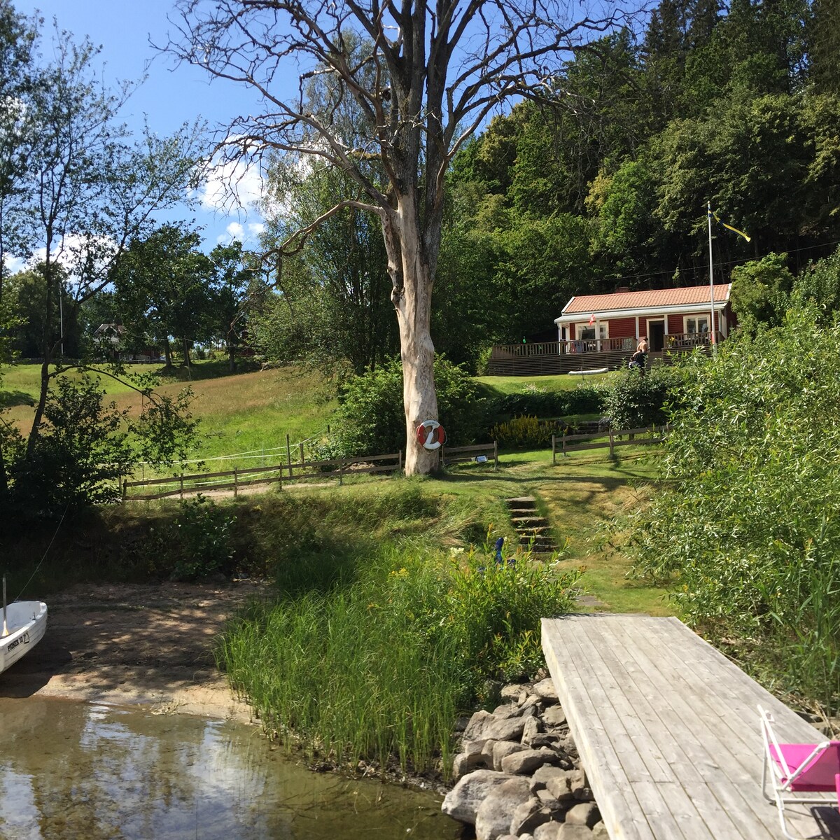 For next summer, pls make a contact. Vores bolig har en fantastisk beliggenhed med udsigt ud over søen. Huset (139 m2) ligger ved søen Ømmern, 50 km fra Gøteborg. Huset, som er placeret på egen halvø (3,5 hektar), ligger isoleret forenden og har sol fra morgen til aften. Fra terrassen går du direkte ud i søen med egen sandstrand og bådebro. Ud over hovedhuset med stor stue m/ pejs, køkken, 4 soveværelser (8 p), findes der et enkelt anneks med plads til 4 extra på sommeren (kan ej opvarmes).