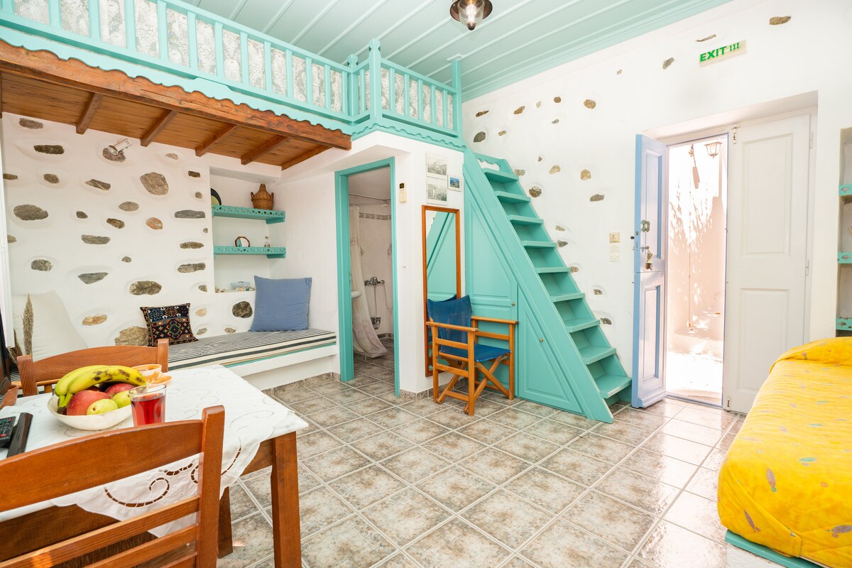 Άνετο στούντιο με εξοπλισμένη κουζίνα, μπάνιο και ιδιωτικό μπαλκόνι. Ιδανικό για ζευγάρια ή δύο φίλους που θέλουν να περάσουν τις διακοπές τους στη μαγευτική Αστυπάλαια. Απέχει μόλις 300m από την Χώρα και 10' με τα πόδια από το λιμάνι. Τέλος, σε απόσταση αναπνοής υπάρχουν σουπερ μαρκετ, τράπεζες, φαρμακείο, καφετέριες και φούρνος.