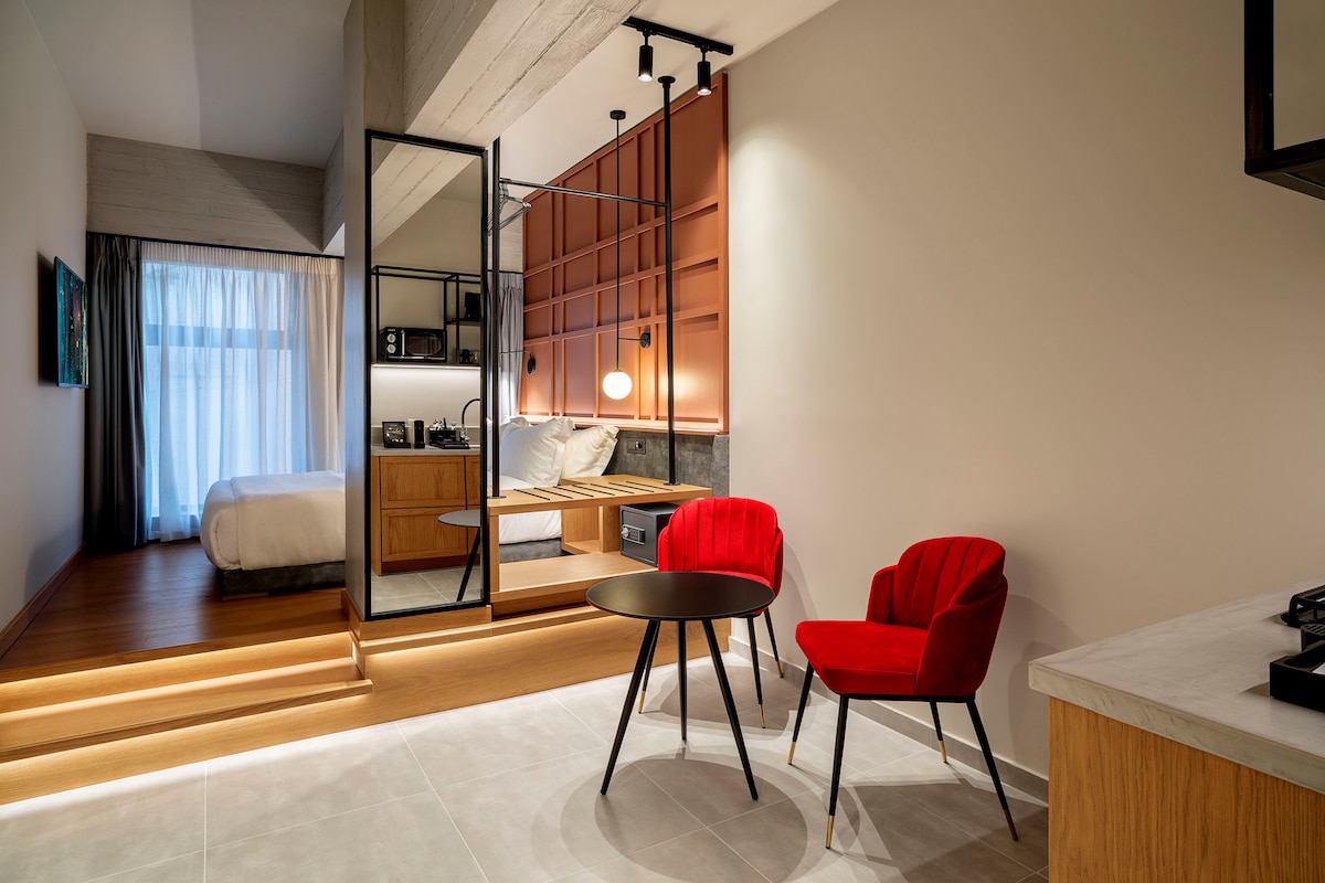 Elegant, modern apartment in Monastiraki, Athens' most central neighborhood. Located merely 300 meters from the Monastiraki subway station, our space offers brand-new hotel design with luxurious finishes. Ideal for a comfortable and memorable stay for a few days, weeks or even months, it beckons you to experience a stylish immersion into the very heart of Athens. Breathing new life into a mid-century textile manufacture, our building’s façade and overall architecture serves as a constant visual