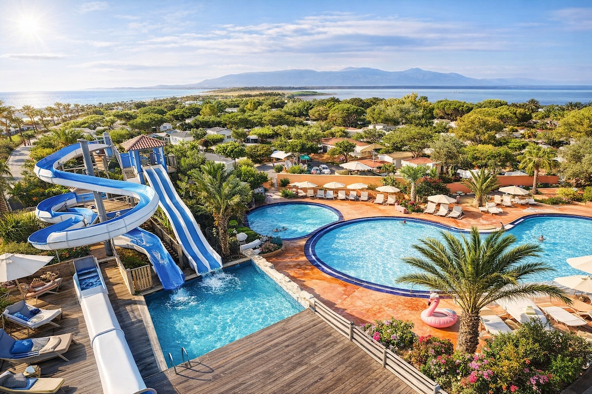 Ved vandet ⭐ Privat strandadgang 50 m væk – Premium mobilhome med aircondition (6/8 pers.) på 4★ campingplads Lukket terrasse, 2 badeværelser, 2 tv'er + Netflix, privat parkering – Ideel til familier og par MAR ESTANG SIBLU LANDSBY 4 ⭐ CANET-EN-ROUSSILLON 3 pools Gratis wi-fi Bocce-bold Søn Slides Børneklub Cykeludlejning Dam Vandreture Spadsereture Øl- og ismaskine Elektrisk ovn Plancha-grill Sengetøj, håndklæder til rådighed RENGØRING INKLUDERET Vaskemaskine Opvaskemaskine Ølmaskine, isterning