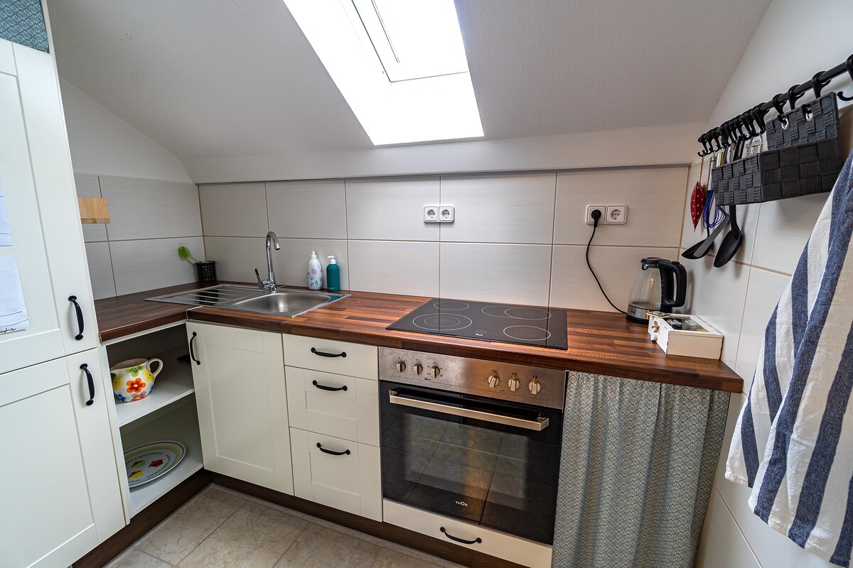 Vores bolig er en stor, veludstyret loftslejlighed. Ud over et hyggeligt soveværelse er der en stue og spisestue med en sovesofa til 2 personer, en læsekrog, et moderne badeværelse og et køkken. Fra soveværelset har du en fantastisk udsigt over Altshausen Slot. Beliggenheden er central (div. butikker, bagerier og restauranter inden for 5 min. gangafstand), men stadig rolig beliggenhed. Haven må gerne deles. En smuk sø, hvor man kan bade, kan nås på 10 minutter til fods.