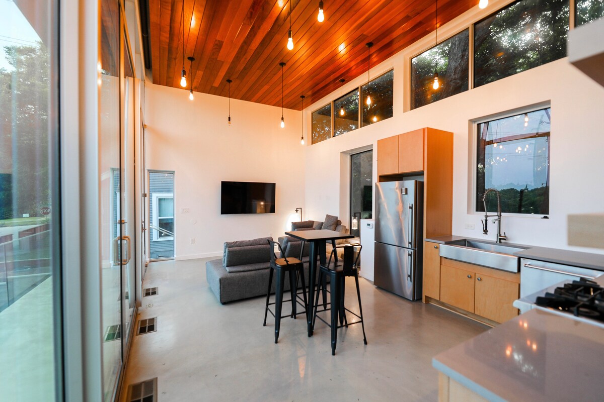 Loftshytte i hjertet af det centrale østlige Austin. Mindre end en kilometer fra UT og 1,5 kilometer til centrum, har hytten en åben og behagelig stemning med naturligt lys mod det brugerdefinerede træværk, trægter og hvælvede fyrretrælofter. Beliggende i det mest eklektiske, interessante kvarter i byen, kan du gå eller køre til centrum på få minutter. Houndstooth kaffe er 1/2 blok væk for den bedste kaffe i byen, og togstationen er på den anden side af gaden med centrum 1 stop væk.