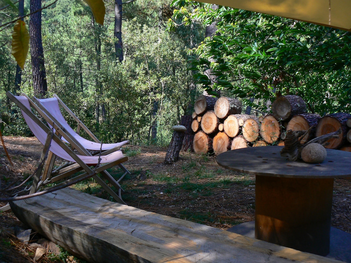 I hjertet af en skov i nationalparken Cévennes i fortryllende omgivelser, kan du tilbringe en atypisk nat i vores Zina-telt, der er omhyggeligt indrettet i en orientalsk stil! Dette lyse rum på 28 m2 er indrettet i en enkel, men raffineret stil, og giver dig mulighed for at komme væk fra hverdagen. Komfortable og originale tørre toiletter står til din rådighed, samt et udendørs brusebad i træ i midten af løvtræerne.