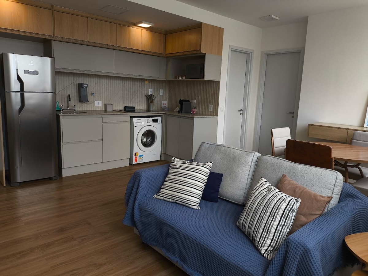 Charmerende, hyggeligt og stille sted. Meget komfortabel Queen size seng, rummelig sovesofa, plads til op til 4 gæster. 50" smart-tv, aircondition, hårtørrer, strygejern, komplet køkken. Perfekt til par. Kæledyr velkomne! Hotelstruktur, reception, indtjekning uden personale, lejlighed med swimmingpool, fitnesscenter, vaskeri, minimarked og område til kæledyr. Parkering på stedet. Campo Belo-kvarteret, 5 minutter fra Congonhas lufthavn, en region med komplet infrastruktur af restauranter, handel og tjenester.