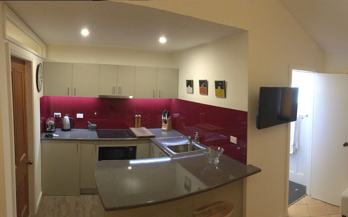 Selvstændigt studie beliggende i haven og fem hektar grund på en privat alpint ejendom. Hydronisk gulvvarme, aircondition, komplet vaskeri og tørrerum, TV/Blueray, Netflix - YouTube - Stan, gratis Wi-Fi, komplet køkken med opvaskemaskine, kingsize-seng. Tyve minutter til Thredbo. Kun ti minutter til Ski Tube. Vinter eller sommer direkte adgang til Alpine Way uden kø gennem Jindabyne. Bemærk, at vi ikke kan oplade elbiler eller HPEV-køretøjer på vores ejendom.
