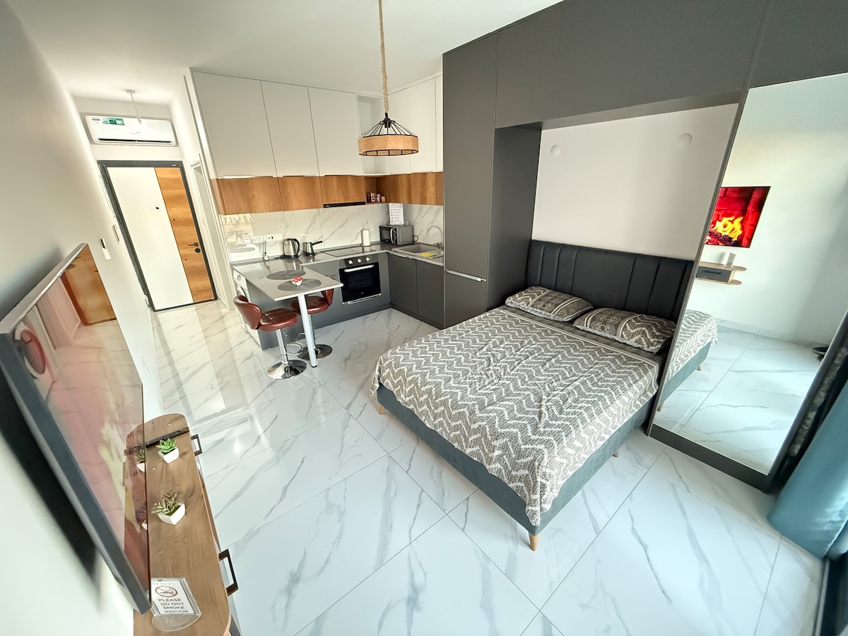 Uhindret havudsigt fra 7. etage, fuldt møbleret, airconditioneret, privat 1+1 lejlighed i et feriested med 13 pools, vandrutsjebaner, spa, børnehjørne, cykeludlejning, biludlejning, mange forskellige restauranter, supermarked, karaoke og gåafstand til det nyrenoverede Long Beach-område, kun en gåtur væk. Famagusta ligger kun 20 minutters kørsel væk, og det er en naturskøn tur til Karpaz langs kysten derfra. Det tager ikke lang tid, før du kalder dette sted dit hjem væk fra hjemmet!