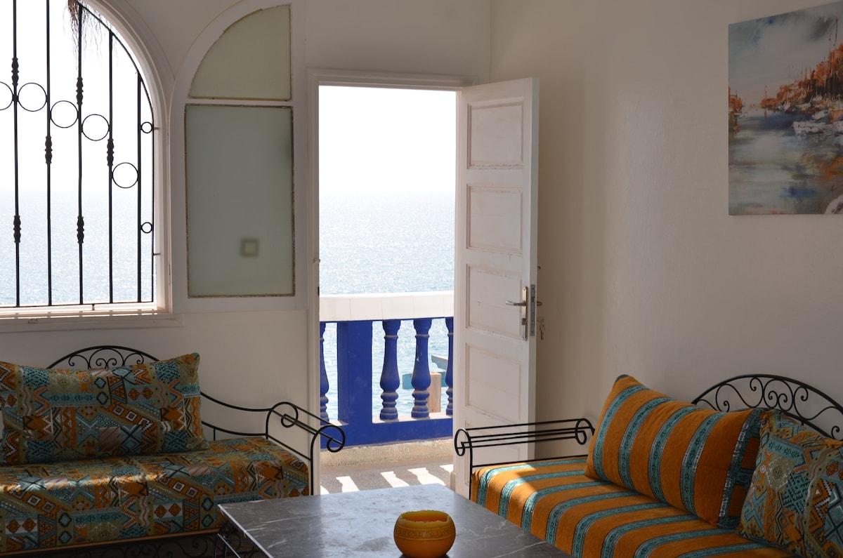 Det er den eneste lejlighed, hvis balkon på 17m2 er bygget over stien, der løber langs stranden, og som giver en enestående udsigt over bølgerne, landsbyen, fiskerne, surferne. Meget komfortabel, indrettet og vedligeholdt med omhu for et enestående ophold over havet, tæt på de mange caféer og restauranter langs stranden og 2 skridt fra surfskolerne, i hjertet af denne venlige berberlandsby, der blander fiskere, handlende, surfere fra hele verden ... og nogle få turister.