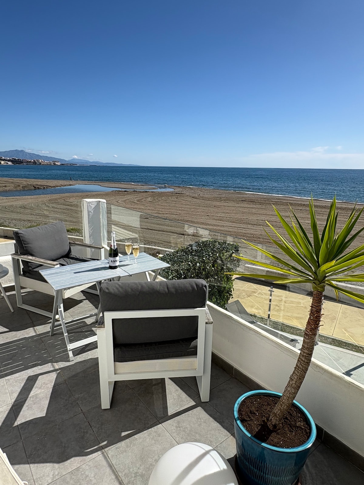 Hvis du leder efter den bedste havudsigt i Estepona, så er du kommet til det rette sted. Ægte strandliv med privat direkte adgang til havet og en næsten 60 m² terrasse designet til at sætte farten ned og nyde. Morgenmad med udsigt over Afrika og Gibraltar, lange grillfester, siestaer i skyggen og solnedgange med lyden af bølgerne. Rummeligt interiør, konstant naturligt lys og et behageligt, intimt layout med en elektrisk pejs. Ideel til familier, par eller vennegrupper. Kun hav, rummelighed og ro.