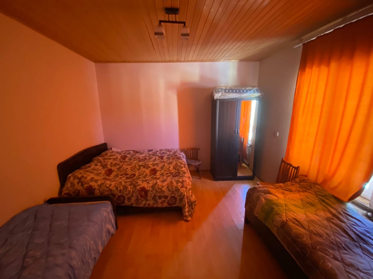 Et fredfyldt sted i Bakuriani Mountain resort, nær Didveli Ski Trail. Der er en hyggelig og rummelig atmosfære i hytten. 2 separate soveværelser med store garderobeskabe. 2 badeværelser, 1 med bruser. Rent køkken og stor sofa, der kan omdannes til seng til yderligere 3 personer. Et tv og gratis wi-fi. Faciliteter på stedet: vaskemaskine, ovn, strygejern, plads til skiudstyr. Der er parkeringsplads til 2 biler foran hytten.