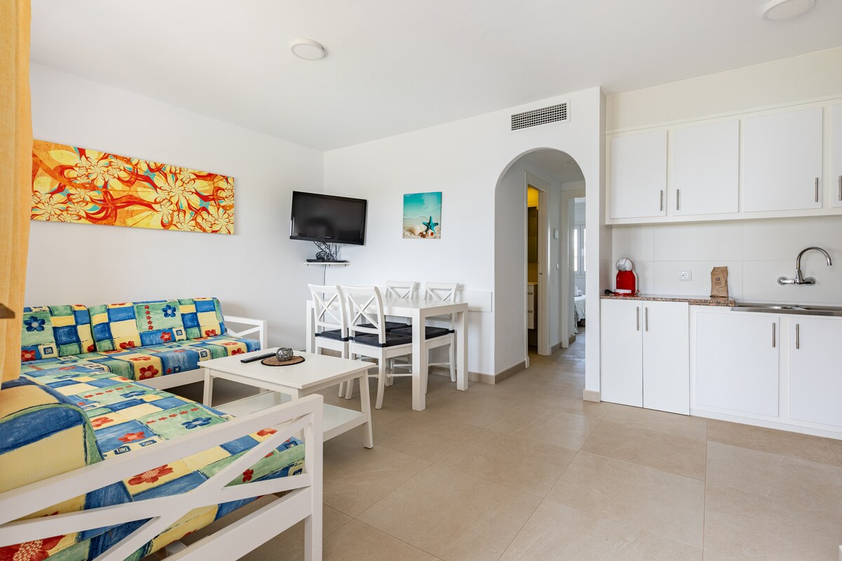 Denne store moderne og lyse lejlighed ligger i Roc Hotel-komplekset. (Hotellet er lukket fra midten af november til midten af marts) Der er plads til 4 personer, den er fuldt udstyret, og gæsterne kan benytte alle hotellets faciliteter: udendørs og indendørs swimmingpools, fitnessrum, dampbad, solarium på taget, direkte adgang til havet med en kort gåtur til en sandstrand. **BEMÆRK, at hotelkomplekset er lukket fra midten af november til midten af marts.**