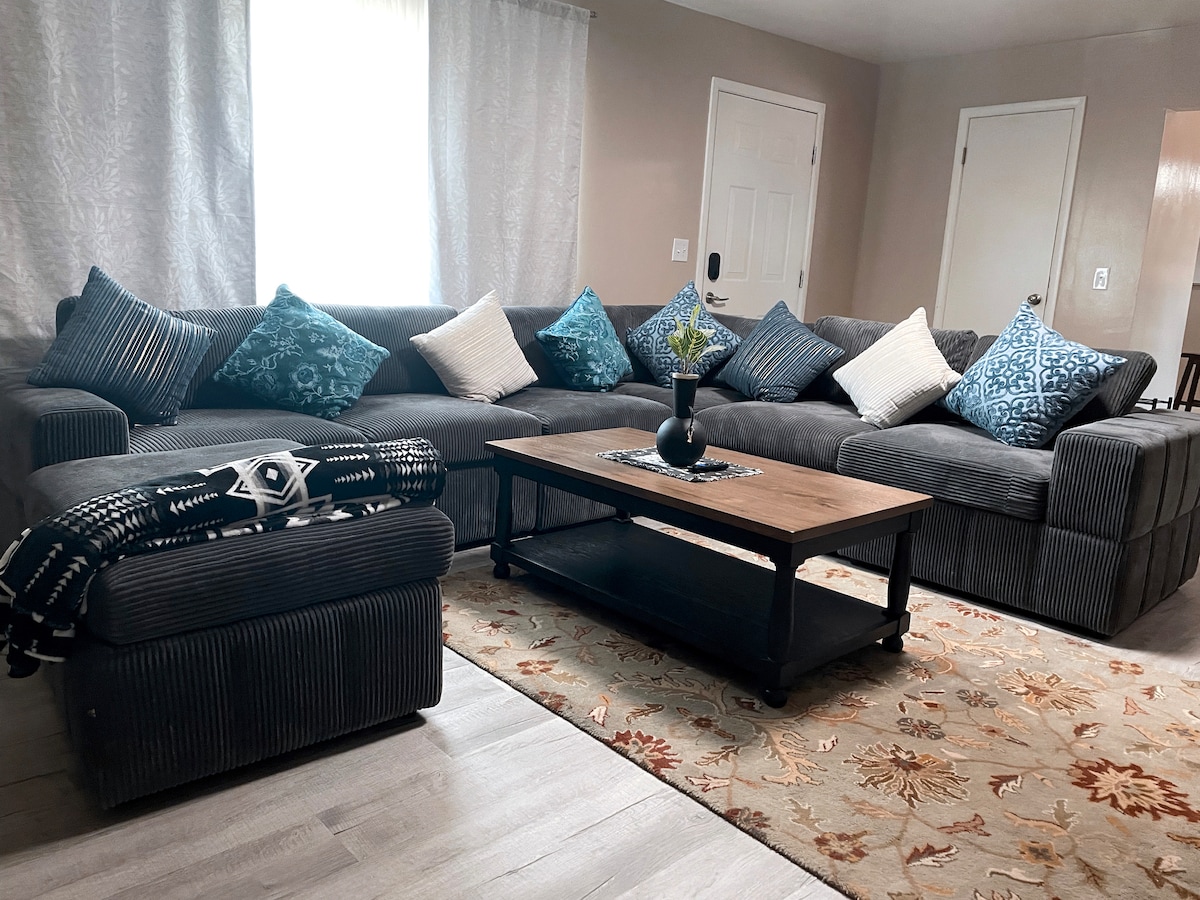Our home is spacious and clean with decorated rooms to fit every style! Our home has 2 large gathering spaces to accommodate guests, 4 Bedrooms, 2 bathrooms, a full-size kitchen with dining area, fridge, sink, stove, microwave, and dishwasher. There is a deck with a view of the surrounding mountains and is a great place to watch the sunset or stargaze. There is access to a laundry room with washer and dryer, High speed internet, flat screen television with Roku, and plenty of parking space.