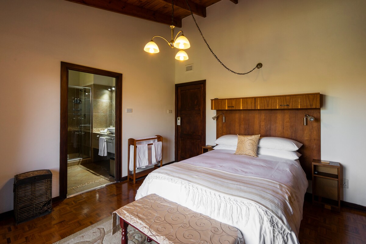Vores Deluxe-dobbeltværelse har en komfortabel dobbeltseng med eget badeværelse. Smuk udsigt over Krantszkloof Conservancy fra terrassen. Vi har vores dyr på ejendommen, 2 små Daxies, en Boerboel en blandet race ung hund samt kat.