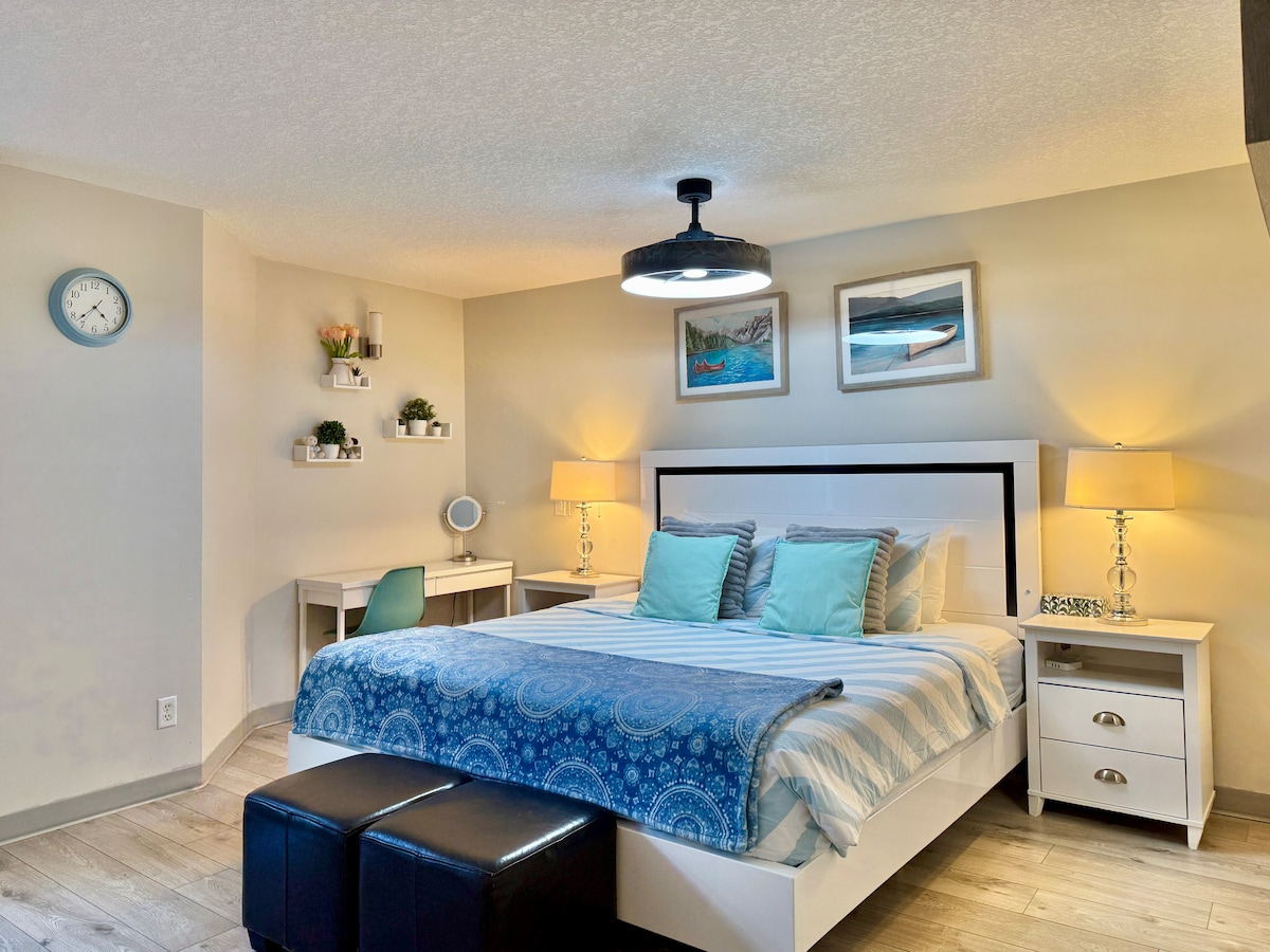 Vores private suite, der ligger i nærheden af centrum, er det perfekte sted at bo på dine rejser. Denne suite ligger i bjergene og er en førsteklasses beliggenhed, hvor alt, hvad Canmore har at tilbyde, kun er en gåafstand væk. Du vil få Netflix TV og gratis internet. En bil kan parkere på en underjordisk opvarmet reserveret parkeringsplads. Banff ligger kun 20 km væk. Der er en offentlig bus, der kører hver time fra Canmore til Banff, og en anden turbus fra Banff til berømte attraktioner.