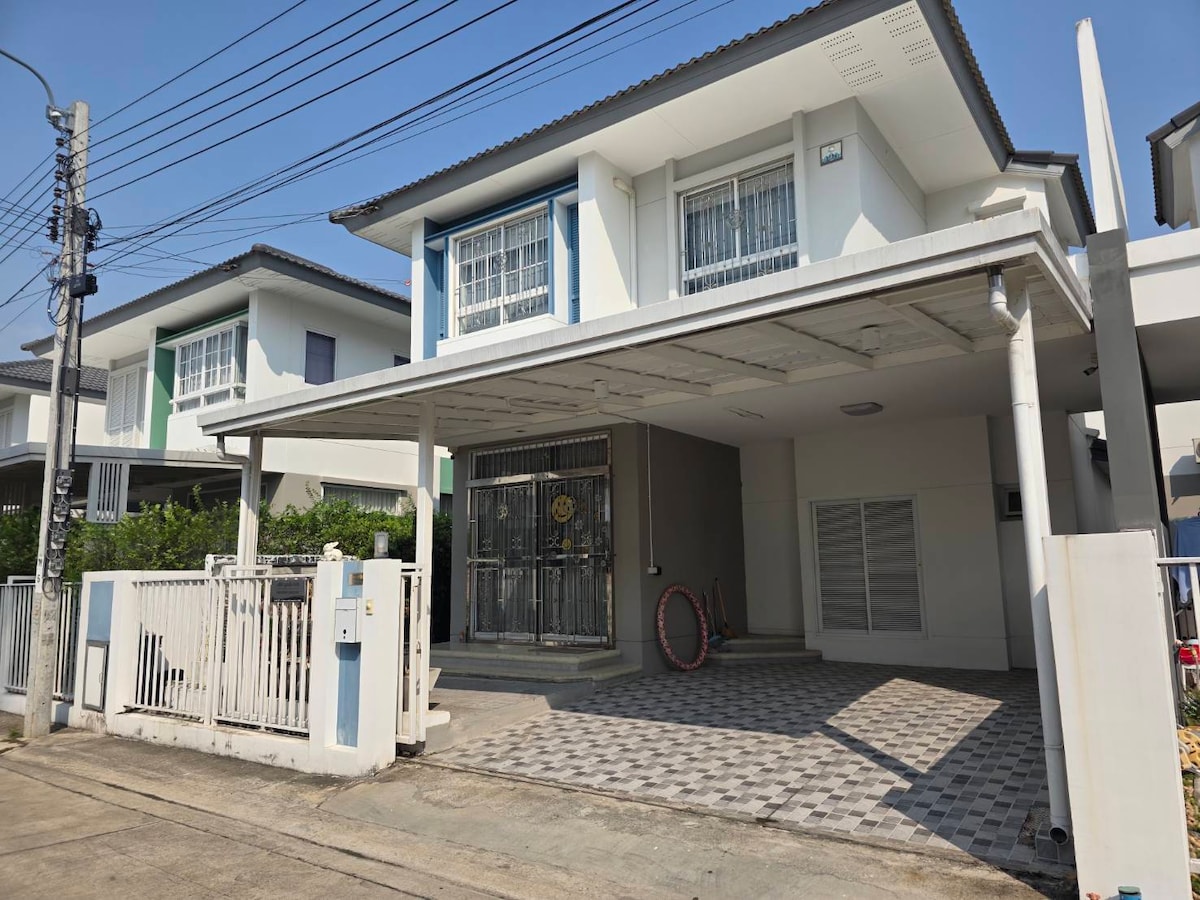 *Velkommen 24 timer, Enkelt hus 2 etager, 230 kvm, 70sqwah,3 senge, 3 badeværelser, fuldt møbleret, WiFi. (Specialtilbud) *Beliggende på hovedvejen. *Tæt på King Rama 9 Park(Suan Luang Rama IX). *Tæt på BTS Skytrain(Yello Line20min), Airport Link(15 min), Suvarnabhumi Lufthavn(20 minutter). *Dagligvarebutik ( 7-11, Lotus ) foran landsbyen. *Thai restaurant foran landsbyen. *Nærliggende indkøbscentre og store middagsmarkeder.