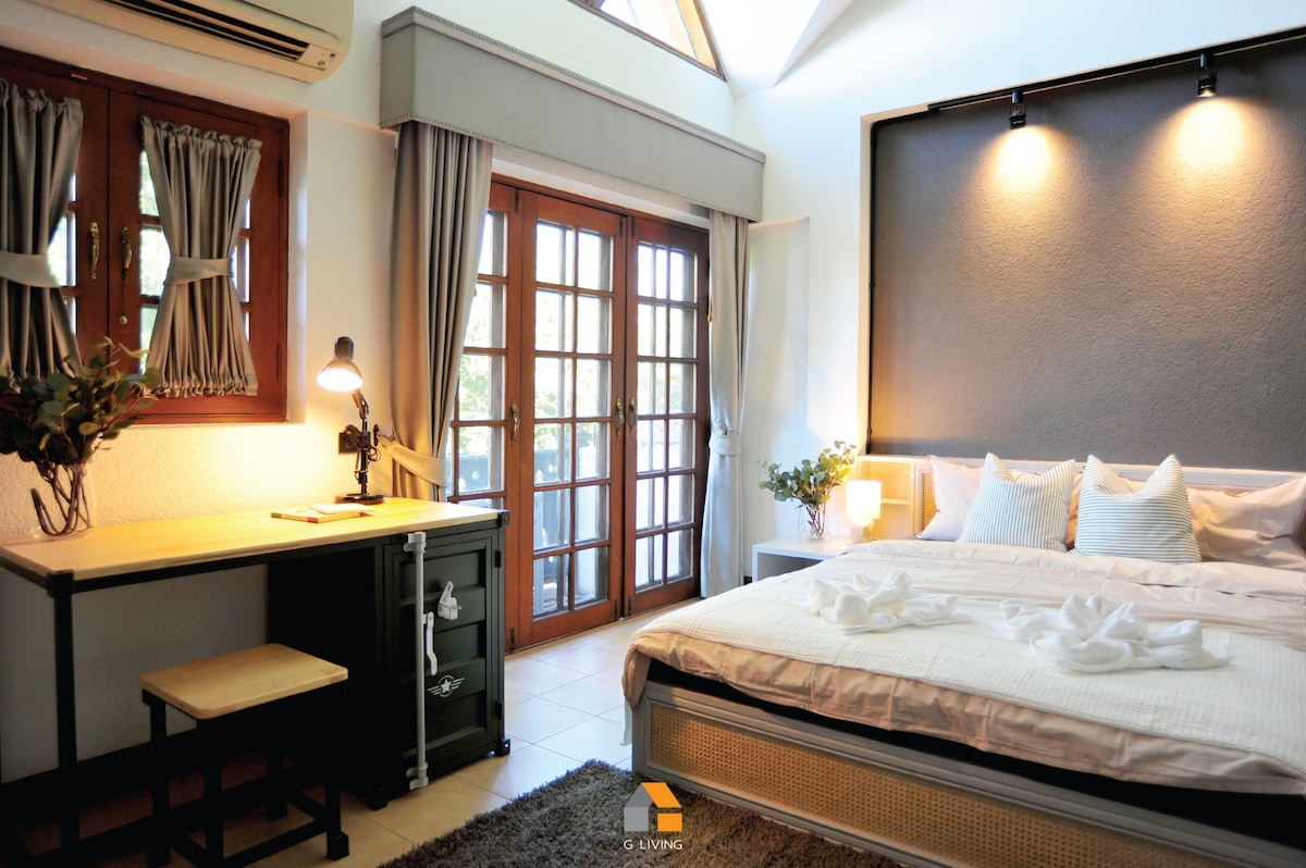 Det private værelse er designet i en varm og hyggelig minimalistisk stil inspireret af Paknam by. Rummet har et minikøkken med mikrobølgeovn. En balkon med en vask giver udsigt over byen og monorail, mens stuen og spiseområdet har en 3 meter lang glasbalkon, der bader rummet i naturligt lys. Gæster kan arbejde, spise og slappe af i et behageligt hjørne af rummet, og der er højhastigheds-Wi-Fi i hele boligen.