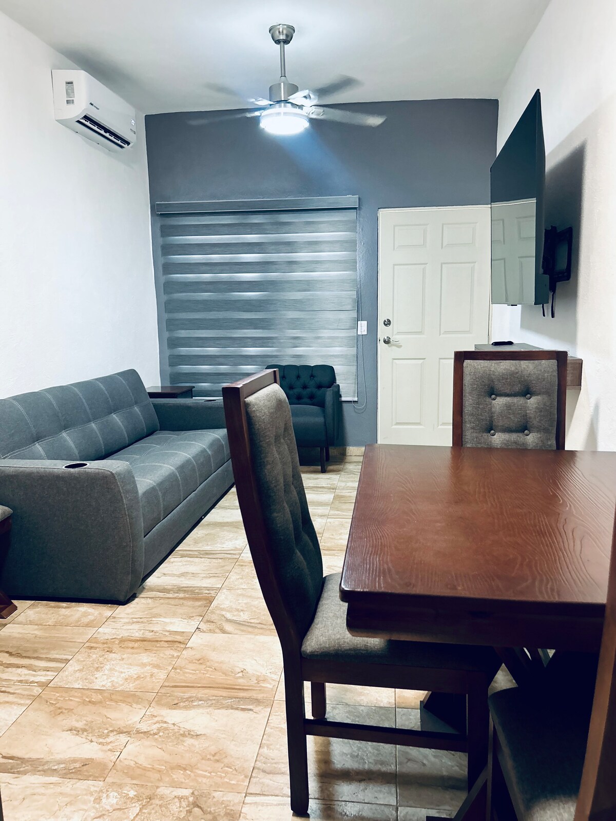Condo Rosina er en nyopdateret 1-værelses lejlighed på 4. sal i 3.14 Living i Nuevo Vallarta, der blev malet om i juni 2025. Nyd udsigten til bjergene og en hyggelig balkon med grill og udsigt til solopgangen. Sovepladser til 2 med en kingsize-dobbeltseng, 1 badeværelse med bruser, fuldt udstyret køkken, kaffestation, højhastighedsinternet, fantastisk ny aircondition og en dedikeret arbejdsplads. Rummelig stue med stor sofa. Gå til stranden på 8 minutter, eller nyd caféer, restauranter og butikker lige nedenunder. Fredeligt og godt beliggende.