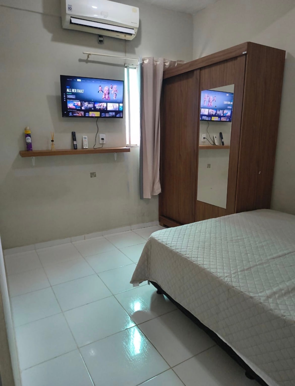 Suíte climatizada aconchegante, composta por uma mina cozinha para preparos rápidos com alguns itens básicos como panelas, pratos, talheres e xicaras , cafeteira, microondas, sanduicheira, cama de casal, roupas de cama e banho, mesa , bancadas, banheiro. Localização de fácil acesso, próxima de supermercado, farmácia, restaurante, lanchonete, bancos, lavanderia, ponto de táxi, parada de ônibus, tudo ao seu alcance. Há 4.8 km de carro do aeroporto internacional. 6.4 km do terminal rodoviário.