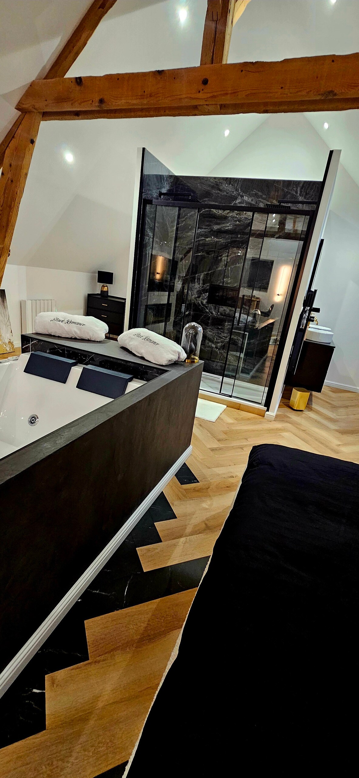 Vores ejendom tilbyder to store, rummelige og komfortable soveværelser samt et privat badeværelse. Den raffinerede og romantiske indretning vil fordybe dig i en ægte kærlighedsrede. Et spaområde med jacuzzi og sauna giver dig mulighed for at slappe af. Du kan også slappe af i haven.