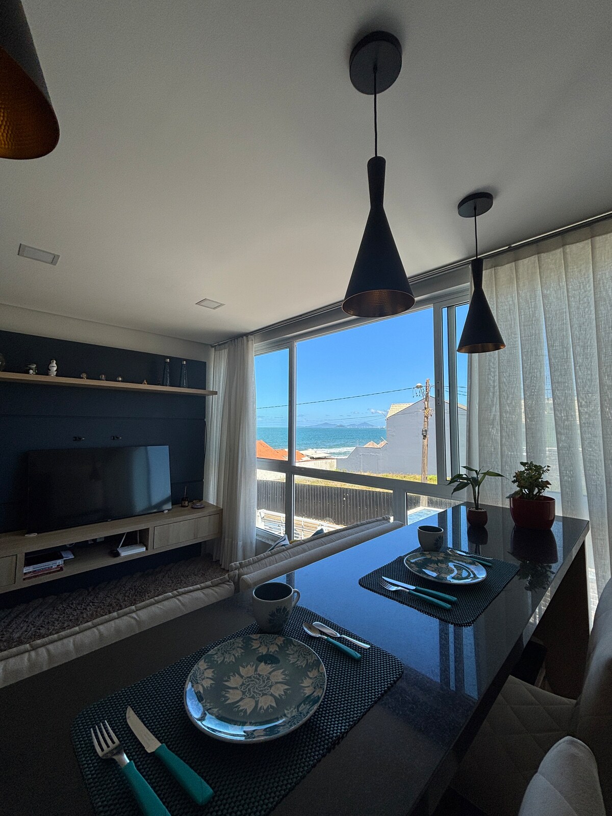 Linda vista para o mar da praia central. Aprecie uma mágica noite ao som das ondas do mar. Perto de bares, mercados, lojas, restaurantes, ao lado da praça central e do Cristo! Completo, aconchegante e charmoso! Com secador de cabelo, ferro de passar, fogão, geladeira, microondas, TV (Disney/Star/Globoplay), louças, liquidificador, sanduicheira, cafeteira, Forno, chaleira e panela elétrica, air fryer, lençóis/cobertas. *Não fornecemos toalhas de banho. Wi-Fi e estacionamento (50m do AP)