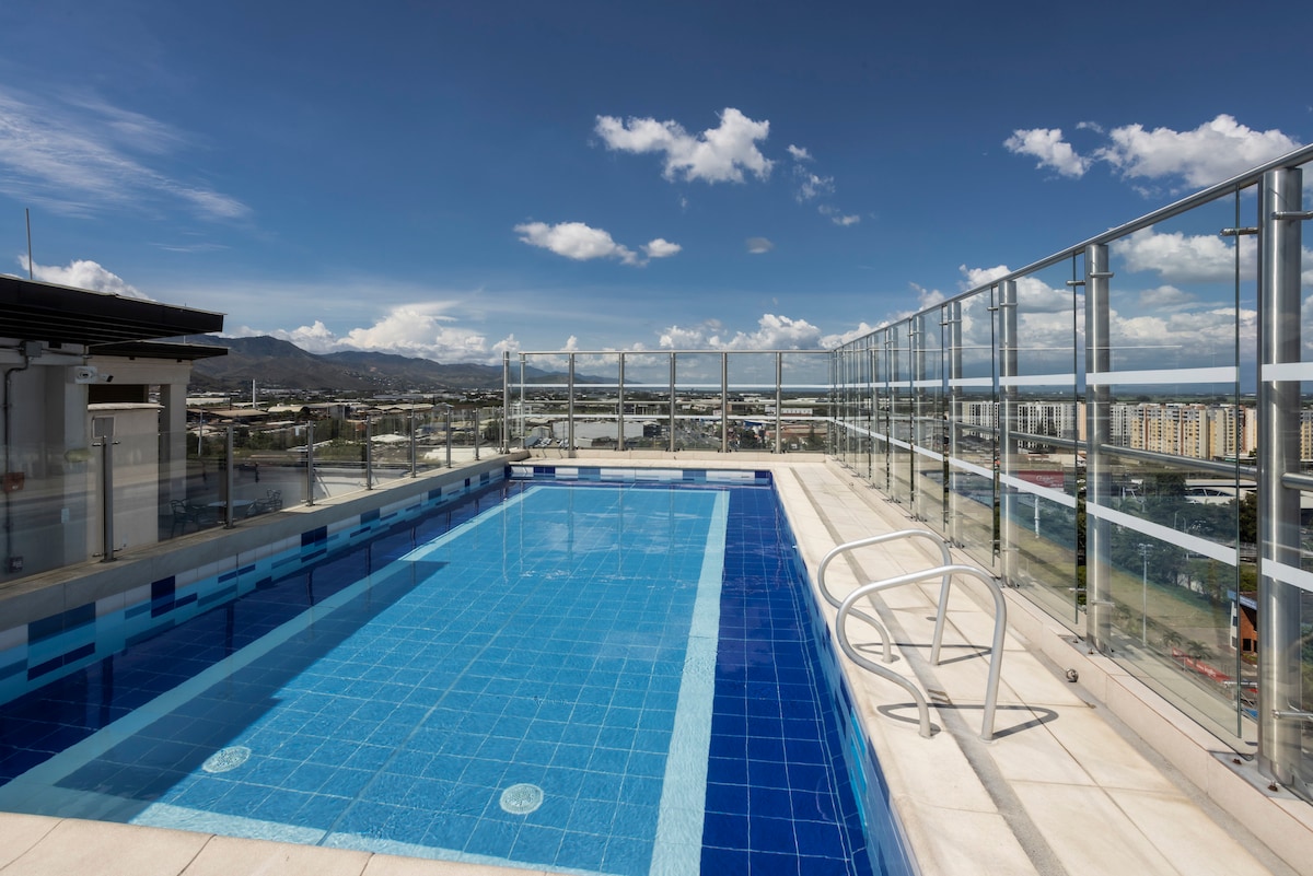 Bygning med moderne design, hvor du kan nyde den bedste udsigt over Cali. Den har en strategisk beliggenhed i den nordlige del af byen: Det vil være meget nemt at planlægge dit besøg! Tæt på lufthavnen, indkøbscentre og gastronomiske områder. Lejlighed med stor privat balkon med hængekøje og sofa, queensize seng, skrivebord, fuldt udstyret køkken, vaskemaskine og badeværelse. Terrasse med 360° udsigt over byen Cali, hvor du kan nyde den dejlige brise og de smukke solnedgange i Cali. Den har udendørs bruser og grill.