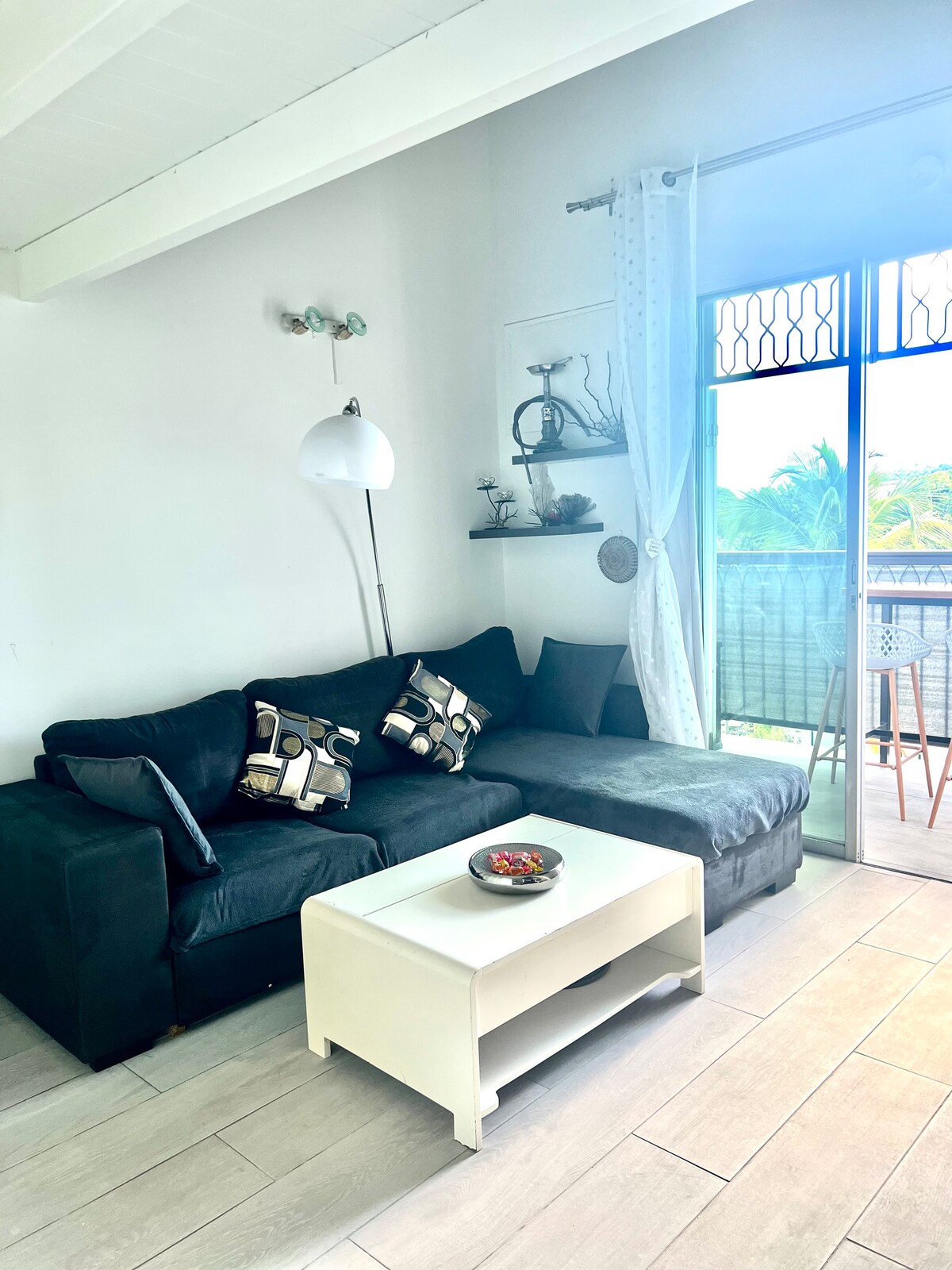 Velkommen til dit fredelige fristed i Bas du Fort, der ligger ideelt mellem Grande-Terre og Basse-Terre. Denne lyse og rummelige lejlighed tilbyder dig en betagende panoramaudsigt fra terrassen: beundre det funklende hav, balletten af både, der sejler ind og ud af havnen i Pointe-à-Pitre, og i det fjerne den majestætiske bjergkæde Basse-Terre med Soufrière, der stolt våger over horisonten.