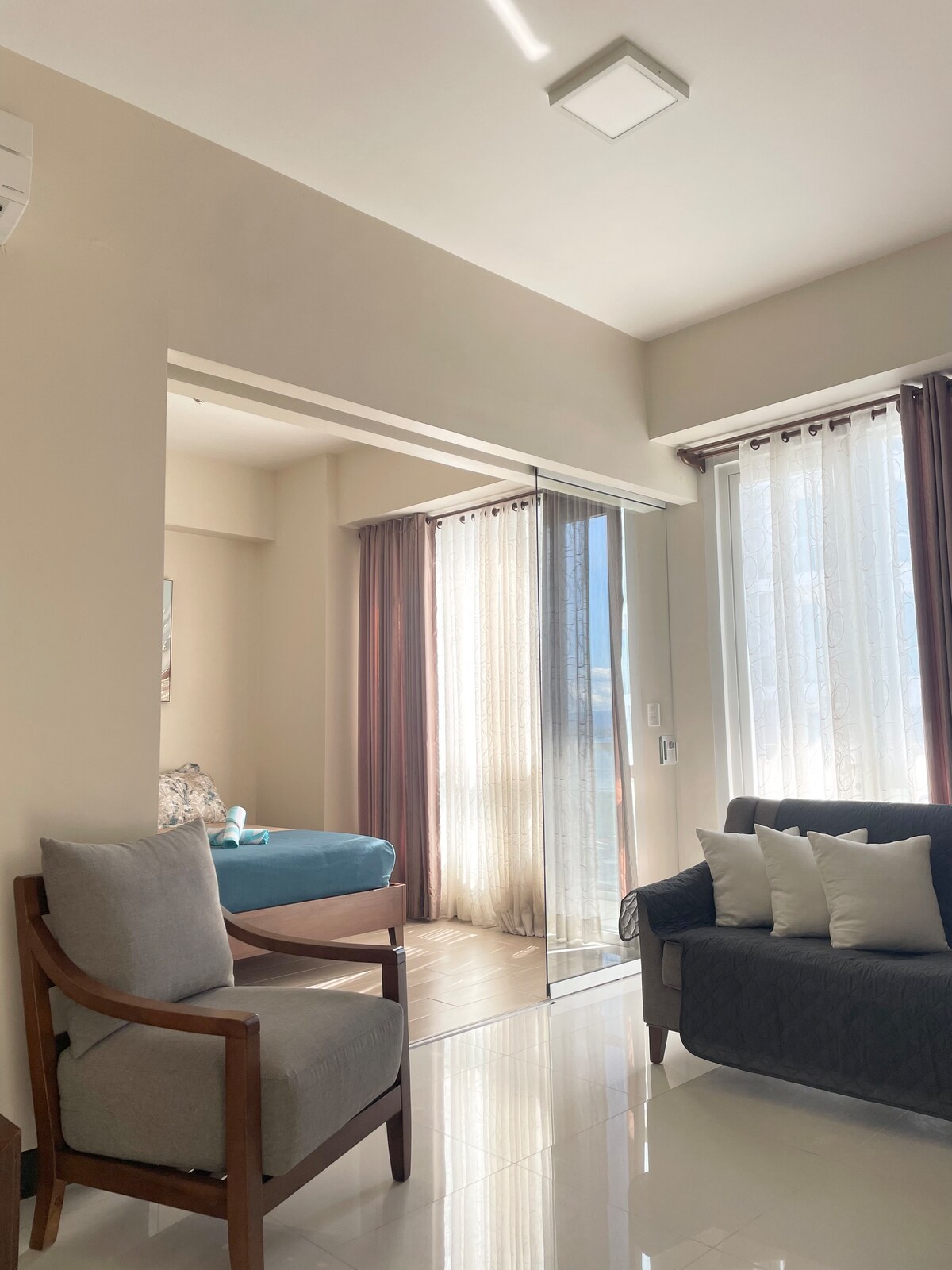 This comfortable and lovely 1BR Suite is your home away from home. Located on the high floor where you will find peace and tranquility, watching the sunrise and sunset in your own private patio. The patio has a view of the sea and lush greenery. All furnitures were meticulously picked and thoughtfully arranged to provide a homey feeling to all our guests. It is also equipped with high-speed internet, 55" smart TV in the living room, 43" in the bedroom and fully equipped kitchen.