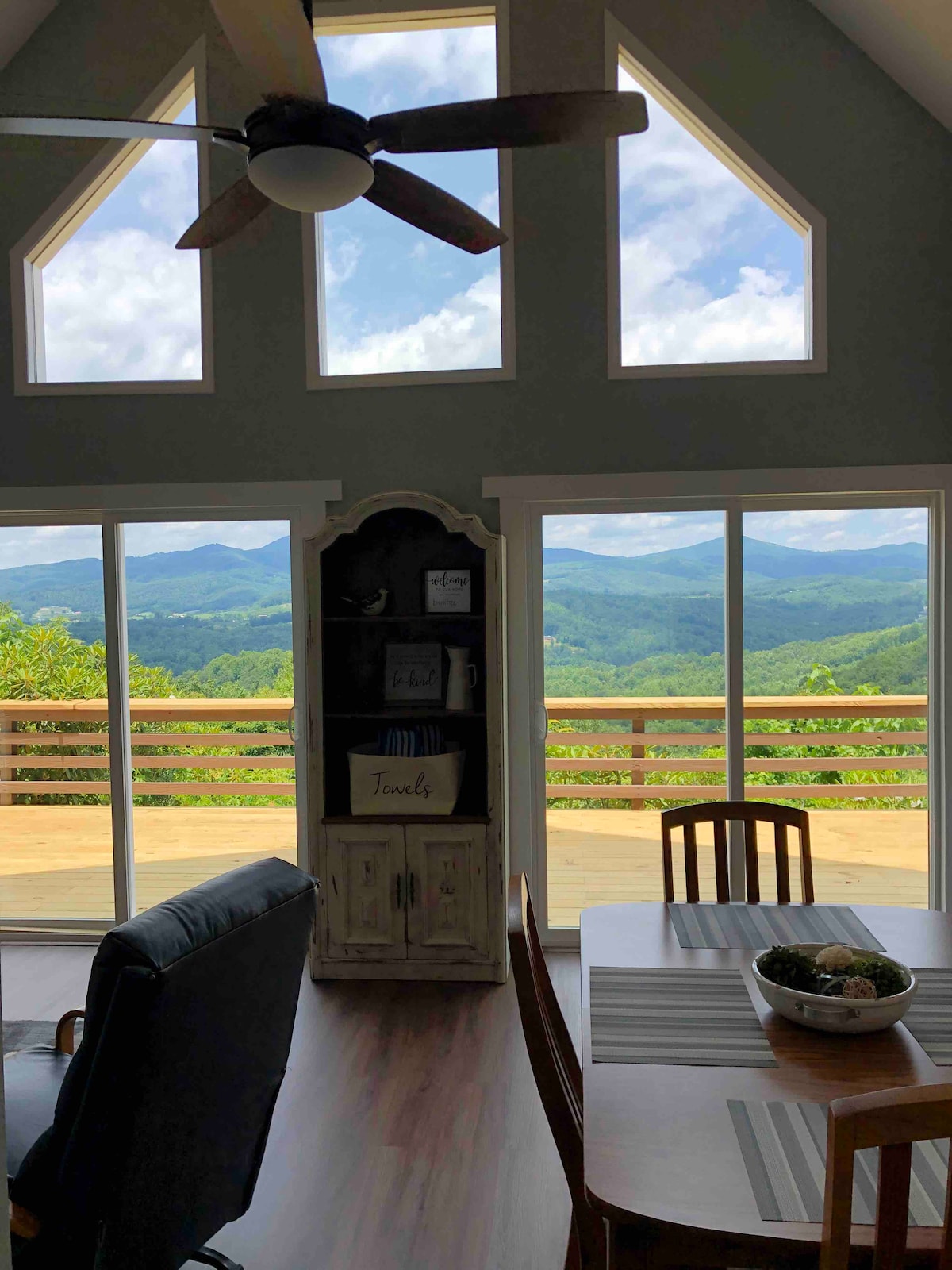 1B/1BA hyggelig hytte med stor terrasse, indhegnet have og en utrolig udsigt over bjergene fra alle værelser, terrasse og boblebad. Se solen gå ned, mens du sidder i boblebadet, eller mens du griller på øverste dæk. Derefter kan du trække dig tilbage til den indhegnede gård og lave smores, mens du sidder omkring bålet. Mens orkanen Helene ændrede landskabet i vores søde landsby, ser vi betydelige fremskridt hver dag i byens genopbygning, butikker og restauranter er nu åbne. Hytten har ingen skader.