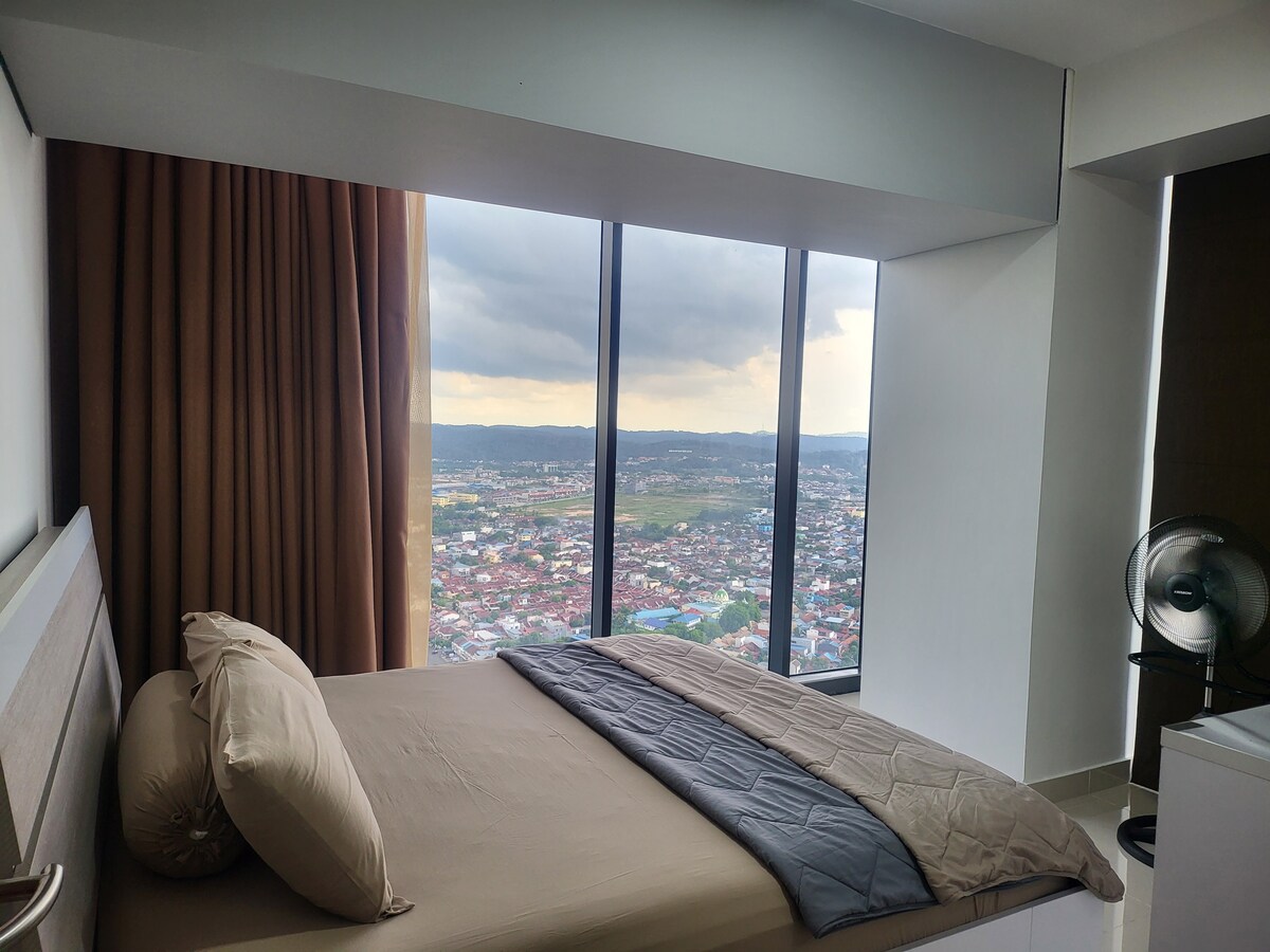 Meisterstadt Pollux Habibie-lejlighed med indkøbscenter nedenunder. Gåafstand til butik og spisested. WiFi tilbydes under opholdet. 50 tommer android-tv til underholdning om aftenen. Vi har en kingsize-seng i soveværelset og en 3-i-1 superenkelt udtræksseng, så det er ikke noget problem at servere for 4 personer. Der er en sovesofa i stuen, så hvis du har en 5. gæst, er vi velkomne til at være vært.