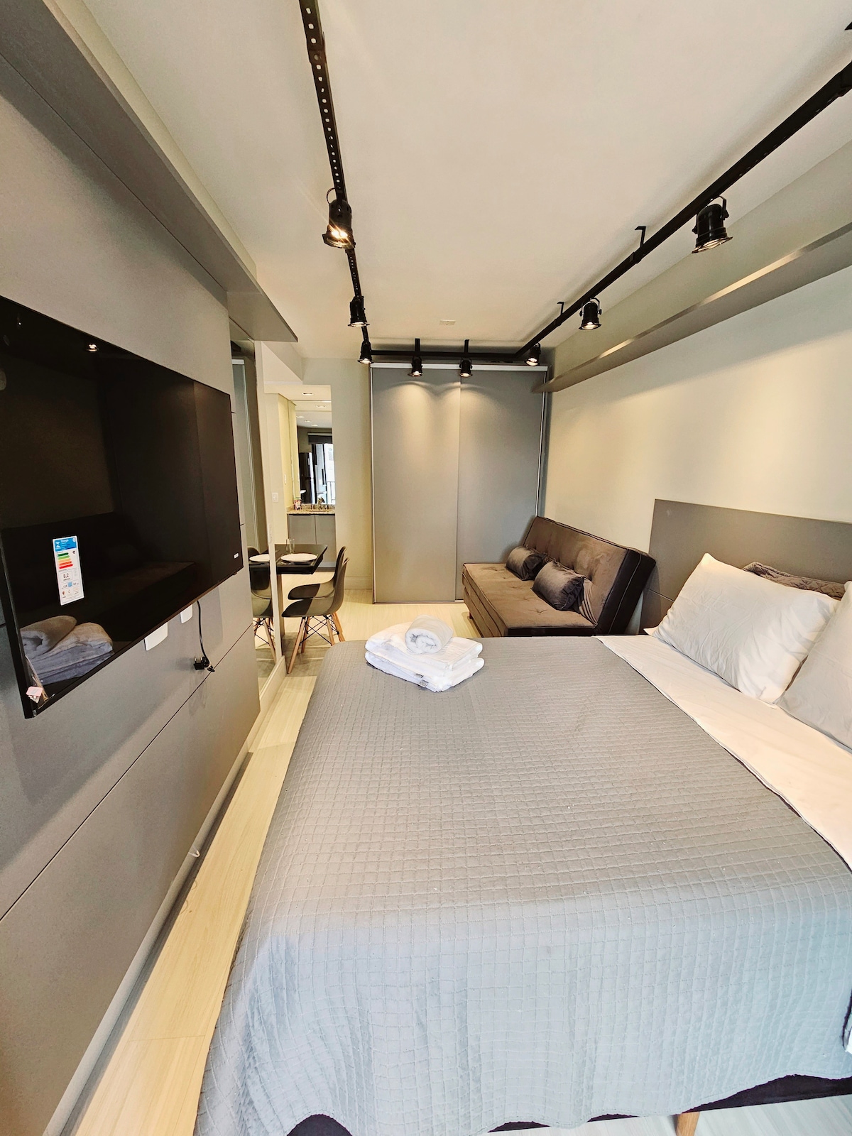 Perfekt balance mellem modernitet, komfort og strategisk beliggenhed. Blandt byens vigtigste gader, tæt på berømte restauranter, barer og shopping samt nem adgang til offentlig transport og kommercielle områder. Omhyggeligt planlagt med en stue, spisestue og køkken, der er harmonisk forbundet, hvilket giver funktionalitet og komfort, og hele miljøet er airconditioneret. Altan med grill. Fuldt køkken med espressomaskine. Soveværelse med en queensize-dobbeltseng.