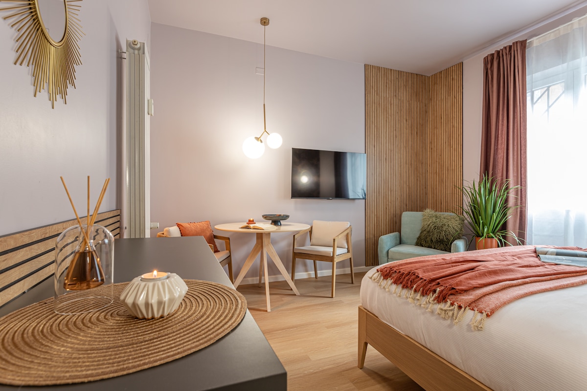 Lejligheden, der blev fuldstændig restaureret i 2022, er indrettet med smag og sans for detaljer. Beliggende i centrum af det område, hvor gladiatorerne trænede, før de gik ned i arenaen, giver dens to store vinduer en fantastisk udsigt over Colosseum. De 75 kvadratmeter, der er optimalt arrangeret, giver plads til 4 gæster på første sal i en smuk bygning fra begyndelsen af 1900-tallet beliggende i hjertet af den evige by. To soveværelser, to badeværelser, wifi, AC.