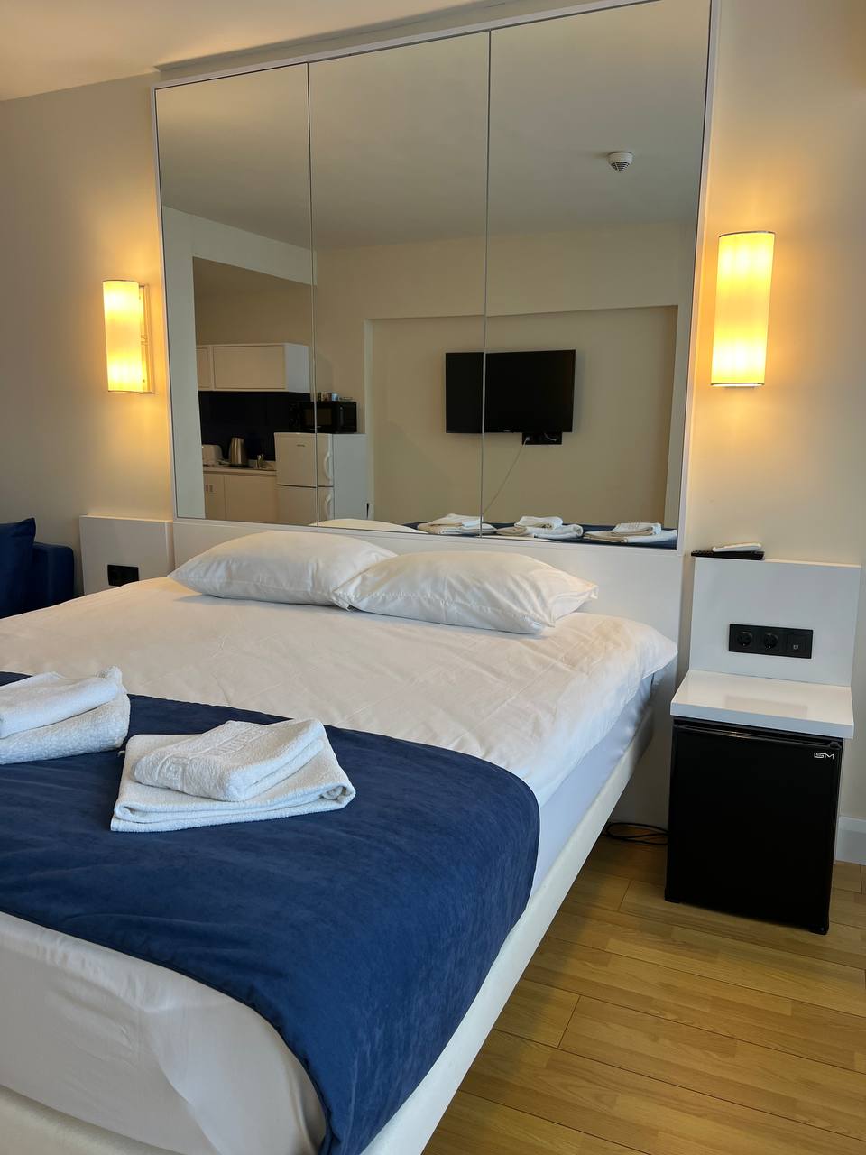 Denne unikke bolig vil give dig levende minder. Rent og lyst værelse på 43. etage. Værelset har en dobbeltseng med en behagelig madras og puder til perfekt søvn, samt en stor sofa. TV, aircondition, bord og to stole. Gratis Wi-Fi, sengeborde. Værelset er udstyret med køkken, køleskab med fryser og selvfølgelig vaskemaskine og mikrobølgeovn. ❗VIGTIGT VED LÆNGERE OPHOLD PÅ 25 DAGE OG DEROVER BETALER MAN SEPARAT FOR ELEKTRICITET