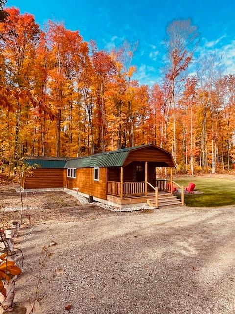 Vi har lige tilføjet en udendørs sauna til denne fantastiske hytte i skoven bag vores hus. Selvom der kun er 1 ordentligt soveværelse, er der et sovehems med en queensize-dobbeltseng og vindue med udsigt over løvskoven. Vi har også en sovesofa. Gæsterne har fuld privatliv og alt til et behageligt ophold Dette er en hytte med fredelig afslapning i tankerne...ingen støjende fester eller noget i den stil. Kom og nyd det nordlige Michigans skønhed på alle årstider.