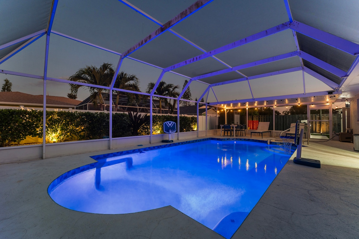 Velkommen til Casa Noir! Din private, fotograferingsværdige oase! Slap af ved den glitrende pool under vægmaleriet af englevinger, slap af på gyngesengen ved bålpladsen, eller gør dit ophold endnu bedre med airhockey, arkadespil og en cykeltræning på en afskærmet lanai, mens du holder øje med børnene i poolen. Hvert hjørne er designet til sjov, stil og det perfekte foto til Instagram. Der er ikke andre ophold, der kan måle sig med dette!