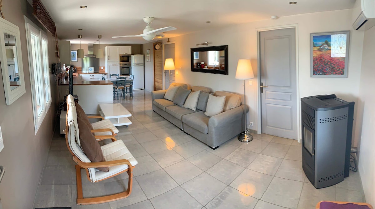 "La Maison aux Oliviers" er et lille charmerende hus på 90m2, med aircondition, uafhængigt og beliggende på en gammel olivenlund, i en rolig landskabspark med en smukker privat opvarmet og sikret swimmingpool. Dens store markise giver mulighed for at opholde sig udenfor beskyttet mod sol og vind (mistral). I nærheden af det historiske centrum, det lokale marked og butikker (til fods), er det perfekt udstyret til fjernarbejde (højhastighedsfiber)