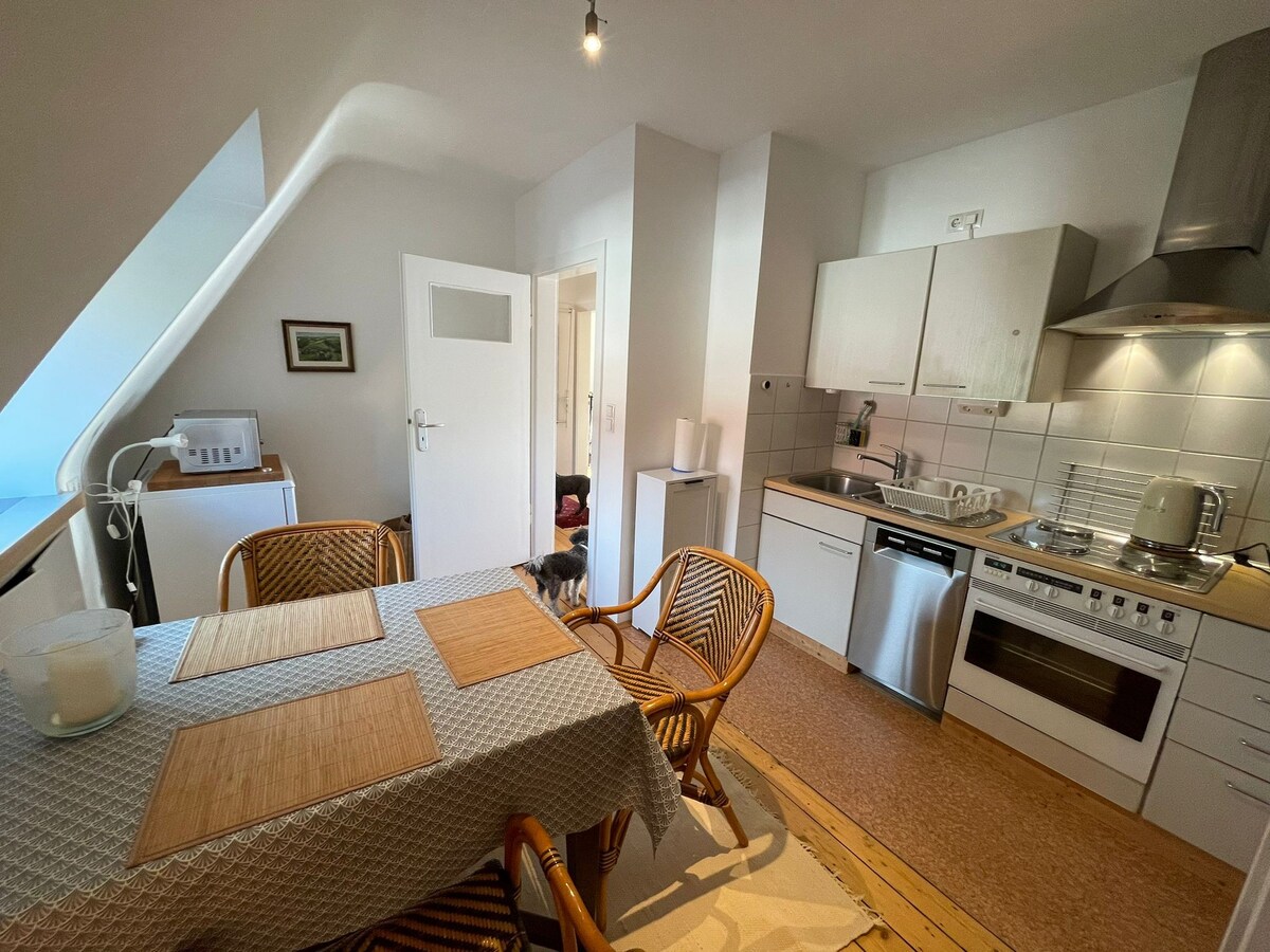 Denne hyggelige lejlighed på ca. 37 kvm er blevet renoveret med kærlighed og en masse naturlige byggematerialer, så den charme, som et gammelt hus kan udstråle, ikke går tabt. Den tilbyder gæsterne en meget hyggelig atmosfære i en idyllisk haveparadis. Gæsterne har gratis parkering direkte foran huset. Der kan også lejes cykler. Forskellige indkøbsmuligheder ligger i umiddelbar nærhed og kan nås til fods.