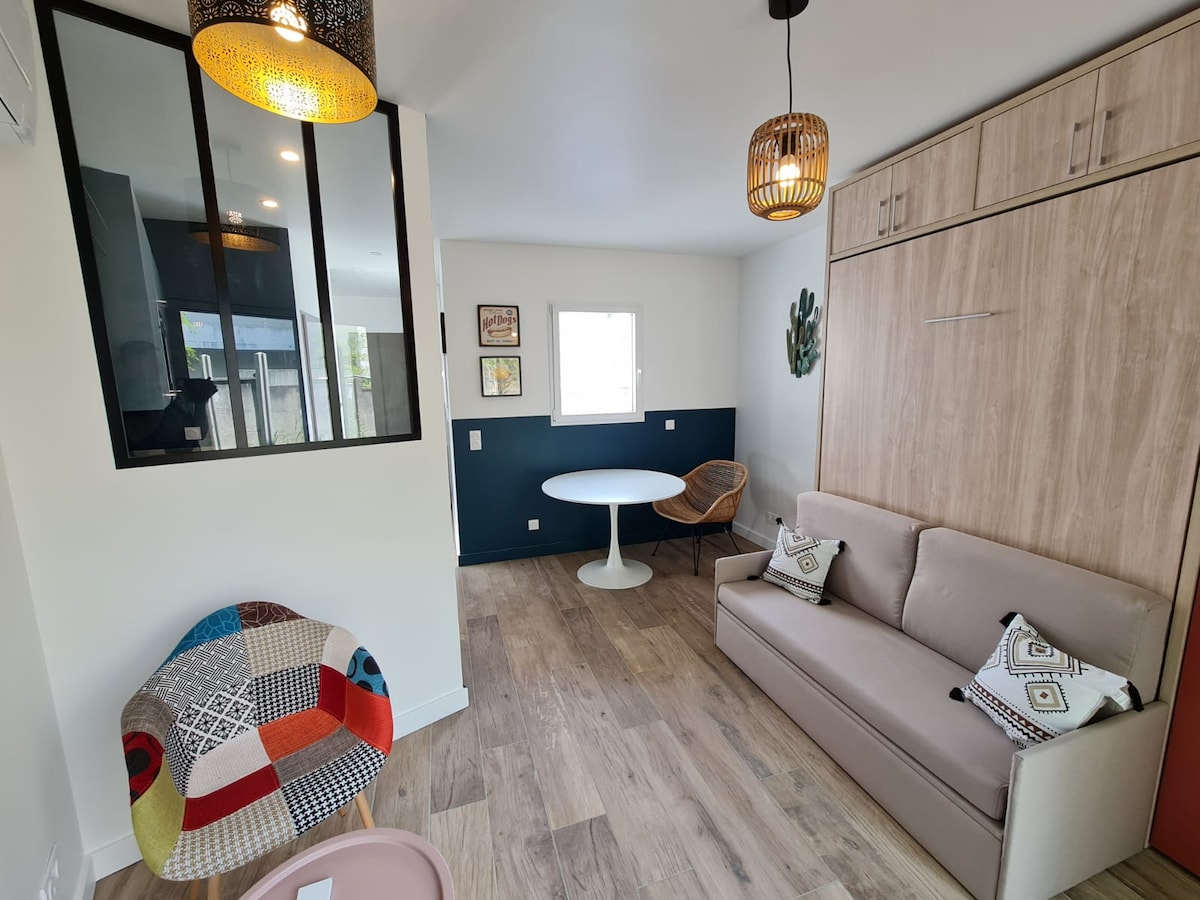 Charmerende 31 m² helrenoveret maisonette, ideelt beliggende 2 minutters gang fra sporvognslinjerne C og F, Stade Musard station, Stade Matmut 30 minutter, 5 minutter fra togstationen, 15 minutter fra centrum af Bordeaux og 35 minutter fra lufthavnen. ARENA 15 minutters gang. Du vil sætte pris på denne bolig på grund af dens komfort, ro, ikke overset, beliggenhed, terrasse og blomsterhave 🌸 Dette hus er udstyret med wi-fi og er perfekt til par, solorejsende eller forretningsrejsende