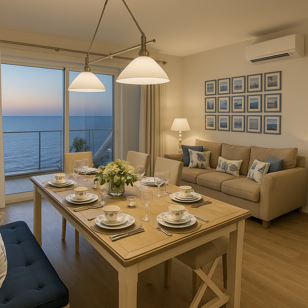 Træd ind i et smukt indrettet kystområde, hvor tidløs elegance møder moderne komfort. Denne charmerende lejlighed har et rummeligt layout, varme naturlige toner og gennemtænkte designdetaljer overalt. Den sande perle er den store balkon med udsigt over det funklende hav – perfekt til at nyde morgenkaffen eller middage i solnedgangen. Den ligger kun få skridt fra stranden og tæt på lokale attraktioner og tilbyder den perfekte blanding af afslapning og bekvemmelighed. Din fredfyldte ferie ved havet venter på dig Book nu!