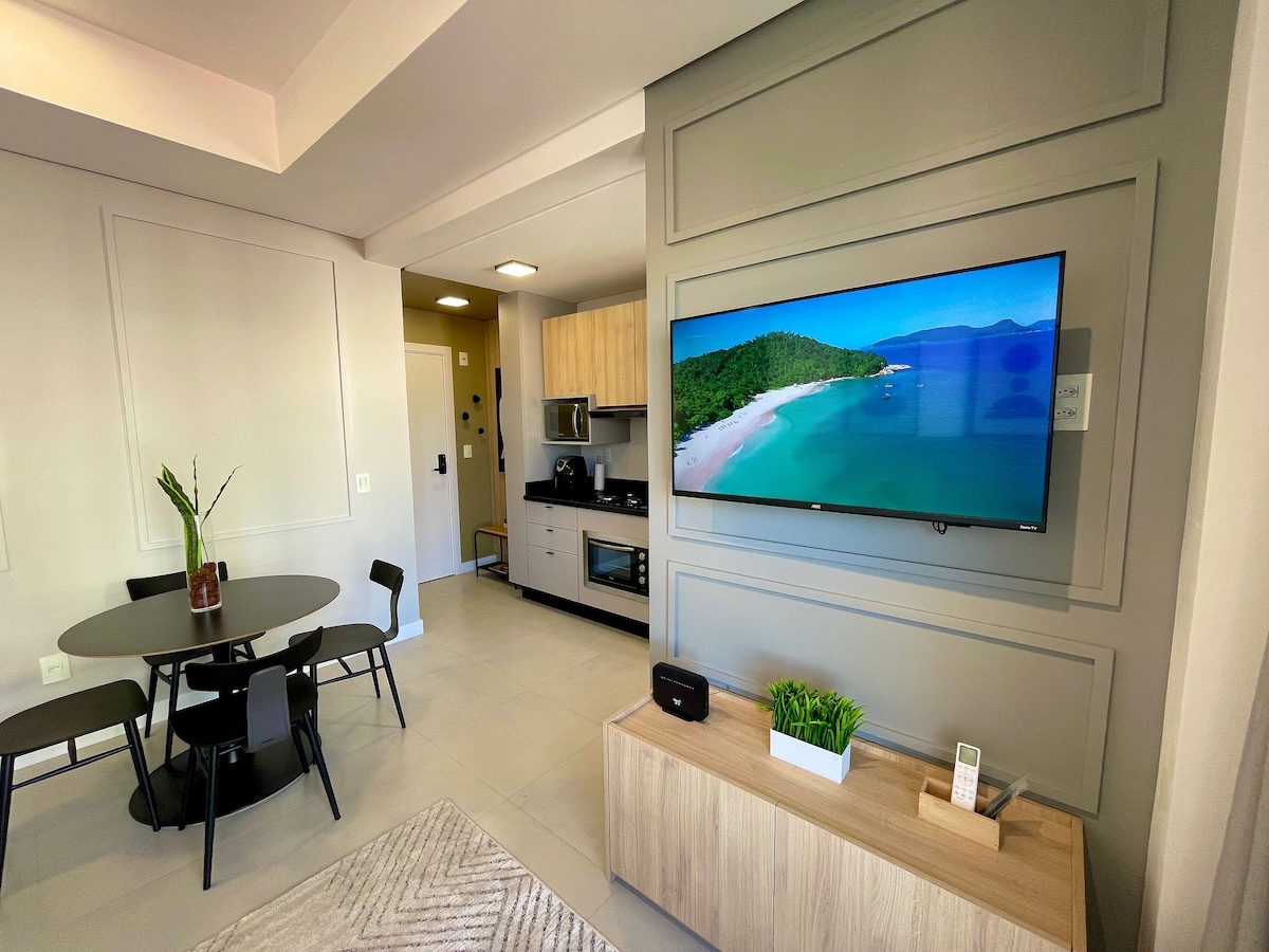 Hvad med at bo i vores studie under dit ophold i Florianópolis? Uanset om du rejser i forbindelse med fritid eller arbejde, og om dit ophold er kort eller langt, vil du have en moderne og højt standardiseret struktur til din rådighed. Beliggende i Complexo Cidade Milano, vil du være i centrum af byen, og du kan udforske øen fra nord til syd, eller bare nyde swimmingpoolen, fitnesscentret, saunaen, eller måske bruge en af lejlighedskompleksets delte cykler til at cykle.