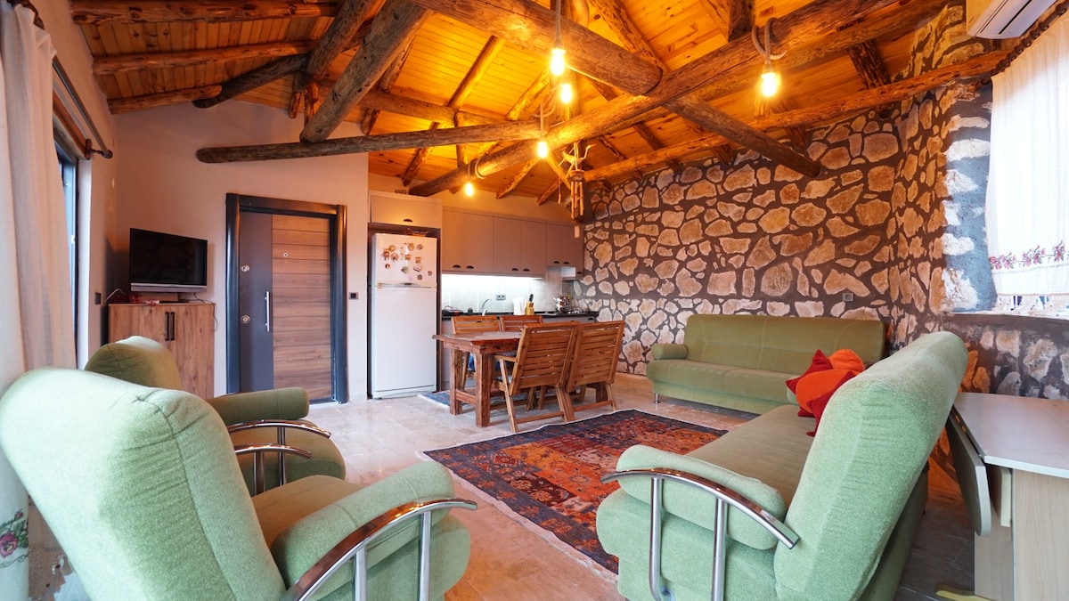 Stenhuset med udsigt over Tahtalı bjerget er inden for 4 hektar. Huset, som har en hydro massage badekar på sin rummelige terrasse, er rolig og velegnet til den person( er), der ønsker at ferie i naturen. Huset ligger 6,5 km fra Olympos strand og 10 km fra Adrasan strand. Der er et andet stenhus 60 meter væk i samme land. Det andet hus er offentliggjort på Airbnb under navnet "Forest and Mountain View Stone House in Olympos". To huse kan udlejes til overfyldte grupper.