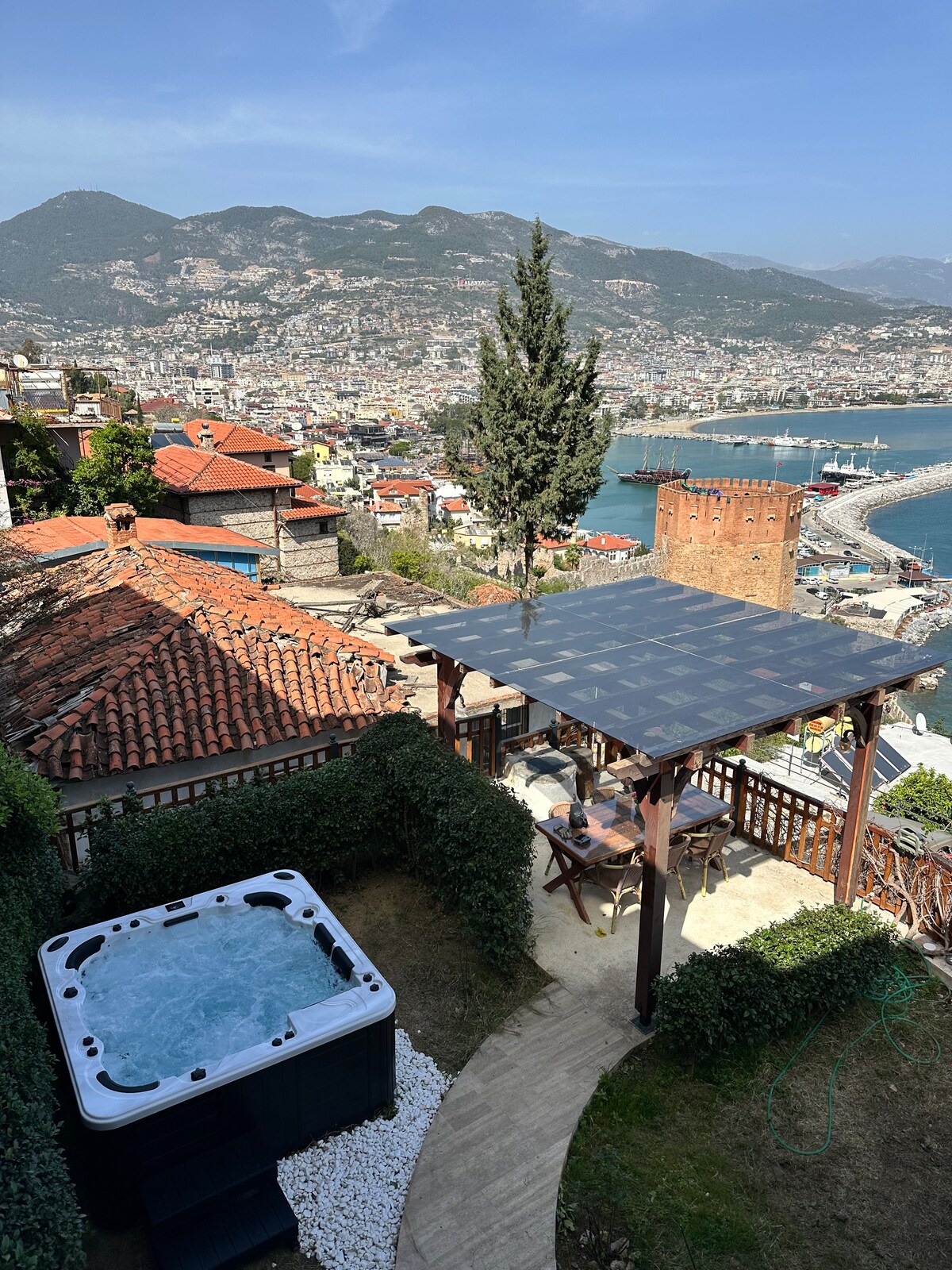En villa med panoramaudsigt til slottet, Cleopatrabeach, Middelhavet med en 500 kvm terrasse og 5x7 m pool (kan opvarmes, hvis du ønsker det). Nyd sommeren hele året rundt. Villaen har alle faciliteter. Terrassen på 500 kvm består af mange siddegrupper, sofaer, baldakin, liggestole, masser af plads. Internet til tilslutning af tv og partyboxmusik. Du kan lave mange aktiviteter på den enorme terrasse for unge og gamle. Du kan ikke finde en mere luksusvilla til ferieophold. Vores familie elsker at være hernede