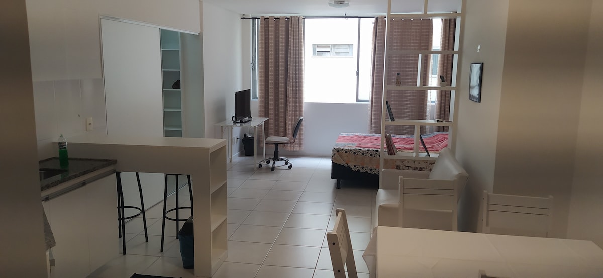 Moderne lejlighed, 32 m2, beliggende på det bedste sted i Sion. Praktisk køkken med minibar, kogeplade, tv (åbne kanaler/Netflix), aircondition, hårtørrer, elkedel og internet. Sydzonen, ved siden af Praça JK og Avenida Bandeirantes, foran et supermarked. Bygningens tagterrasse har fitnessrum, sauna, swimmingpool, opholdsområde og fælles køkken (vand, ismaskine). Rengøring tilgængelig efter behov. Sikker bygning med dørmand døgnet rundt. *Garage er ikke inkluderet.