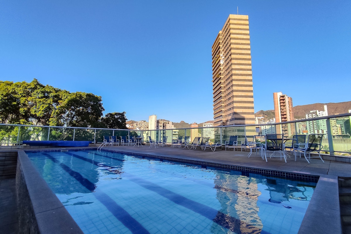 Flat Superior Plus-kategori - luksus! Moderne med unik designer. Høj etage med panoramaudsigt til BH. Meget privilegeret beliggenhed, denne luksus i Alto da Afonso Pena,er et højdepunkt i logistikken for rejser i BH, der nemt kan nå turist- og forretningsstederne. Lejlighed med aircondition, 32"tv, arbejdsbord, minibar, hårtørrer og pengeskab. Stedets struktur har en restaurant, fitnessrum, swimmingpool, sauna, lobbybar, Wi-Fi, roomservice døgnet rundt og 8 arrangementer.