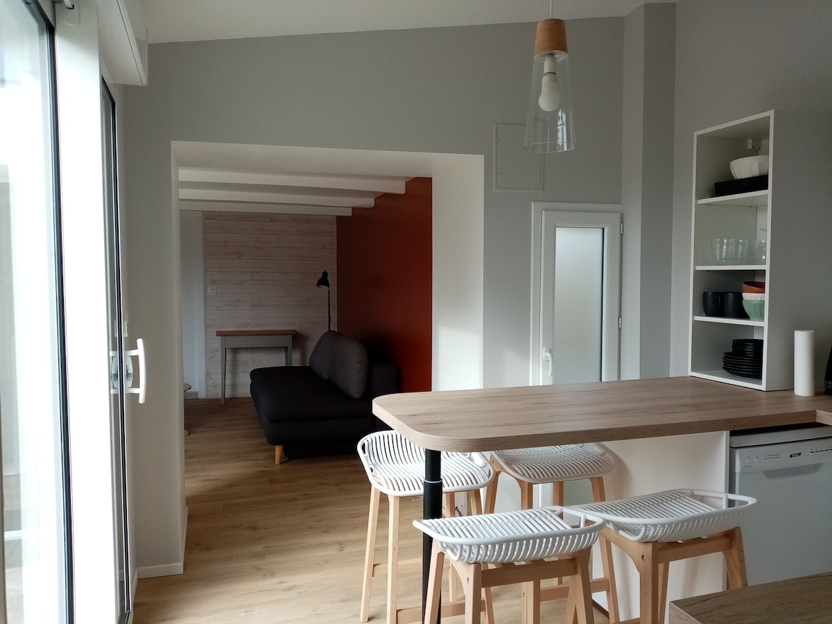 Kære feriegæster, for at tilbyde dig den bedst mulige velkomst og sikre et behageligt ophold, inviterer vi dig til at læse hele opslaget, inden du færdiggør din reservationsanmodning. I juli og august er ankomster og afgange på fredage. Tak Kom og genoplad batterierne ved at bo i dette hus på mere end 90 m2, der er totalrenoveret og smagfuldt indrettet i udkanten af Rivière d'Etel, roligt beliggende i en blind vej og 200 m fra den første lille strand.