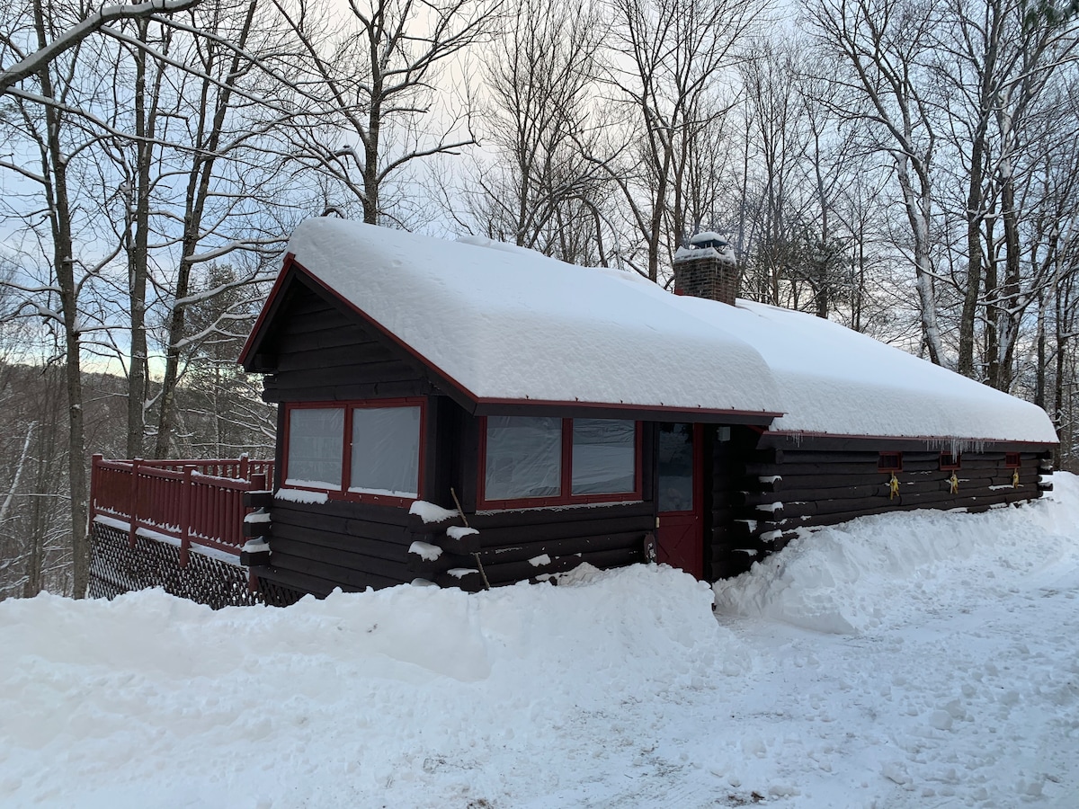 Hyggelig bjælkehytte mellem Mount Snow og Stratton
