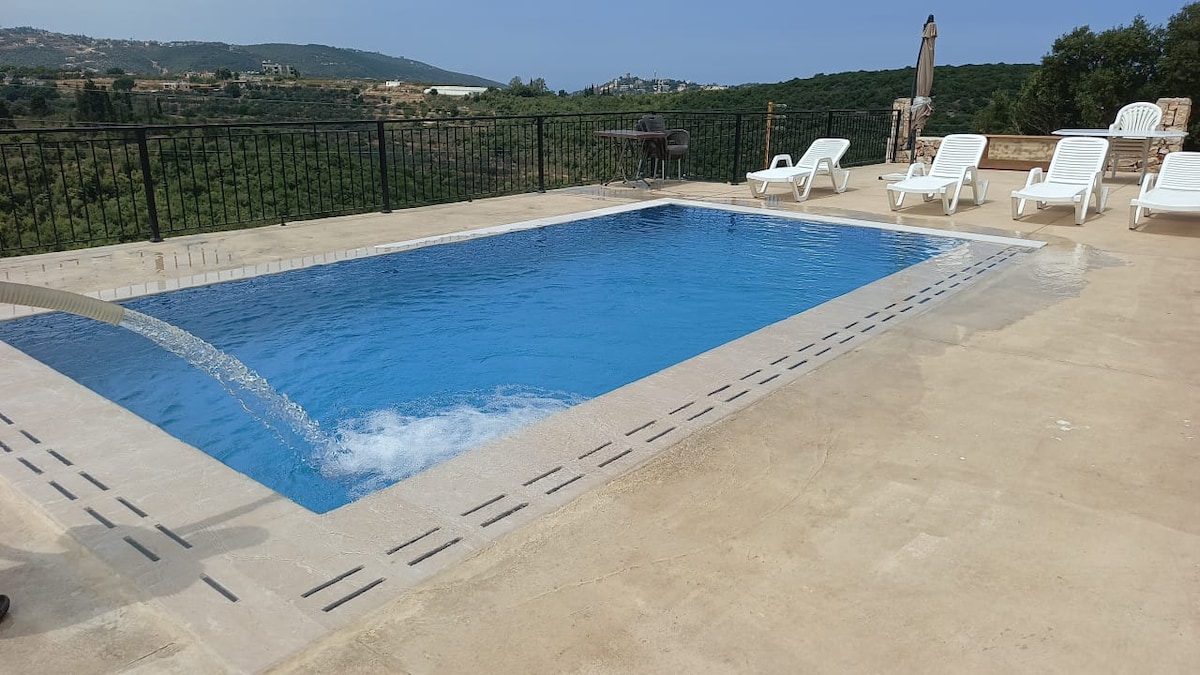chalet beliggende i Zaarour, helt privat med en betagende udsigt, hvor du kan nyde lidt kvalitetstid. Dette private hus omfatter: 2 soveværelser (1 dobbeltseng, 2 enkeltsenge, plus 2 sofaer i stuen), Stue Fuldt udstyret køkken med ovn, køleskab og mikrobølgeovn. Bemærk, at der ikke er bestik, tallerkener eller kopper i hytten, du rådes til at medbringe dine egne. Badeværelse med bruser og badekar Separat toilet Privat indendørs jacuzzi Privat have Privatpool 5m*4m*120m Gratis Wi-Fi