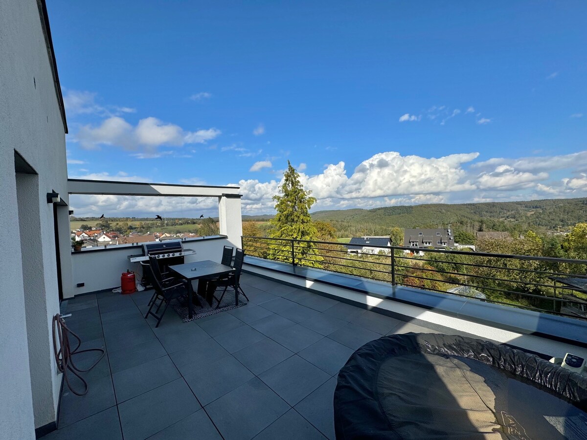 Velkommen til "Haus Hermann" – et sted for wellness og eventyr med moderne faciliteter. Nyd den smukke udsigt, og find din udflugt til at slappe af og slappe af i vores officielt certificerede 5-stjernede feriehus. Huset blev bygget i 1964 af vores bedsteforældre og blev grundigt renoveret i 2023. Højdepunkterne er: sauna, jacuzzi, fitnessrum, gasgrill, forskellige medier og spiltilbud (smart-tv, soundbar, Nintendo Switch, Netflix, 150 tv-kanaler, bordfodbold, bordtennis, dart, brætspil)