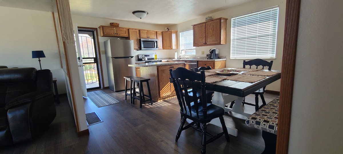 Studiet er 500 kvadratfod, åbent koncept. Køkkenet har komfur og køleskab i lejlighedsstørrelse, mikrobølgeovn, brødrister og Keurig. badeværelset har et stort brusebad, intet badekar. Soveområdet har en kingsize-seng. Boligen er designet med lethed og komfort i tankerne. Den er knyttet til mit hjem, men med uafhængig bolig. Mulighed for parkering under carporten eller ved siden af huset. Beliggende 5 minutter fra Marietta med nem adgang. Elektronisk tastatur. Nyd at besøge Roadrunner's Haven.
